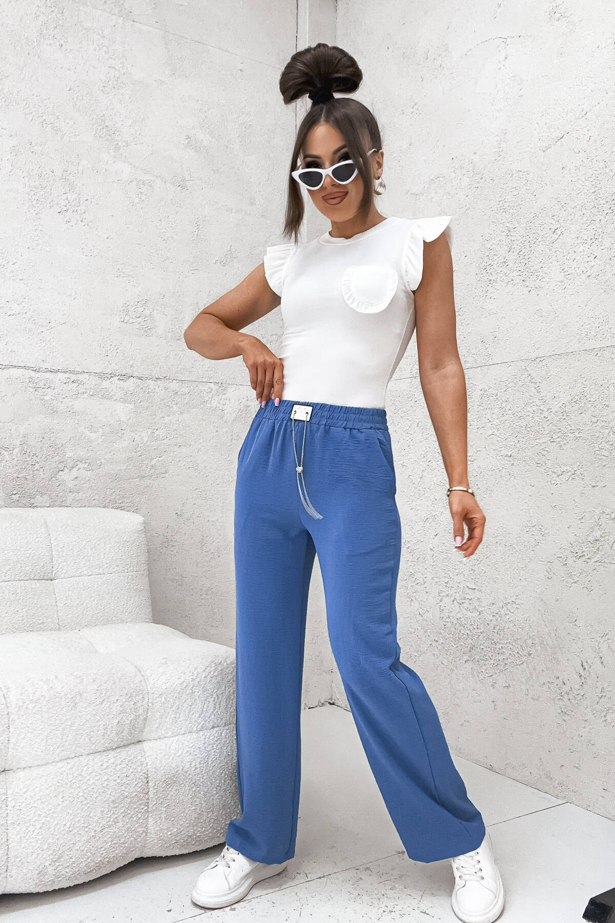 SPODNIE MATERIAŁOWE Z SZEROKĄ NOGAWKĄ I ŁAŃCUSZKIEM W PASIE- NIEBIESKIE