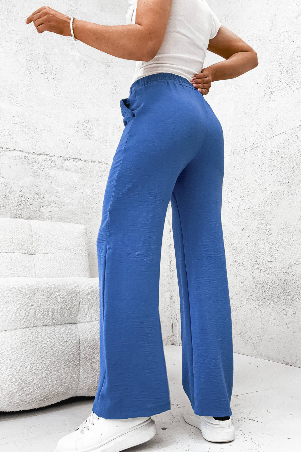 SPODNIE MATERIAŁOWE Z SZEROKĄ NOGAWKĄ I ŁAŃCUSZKIEM W PASIE- NIEBIESKIE