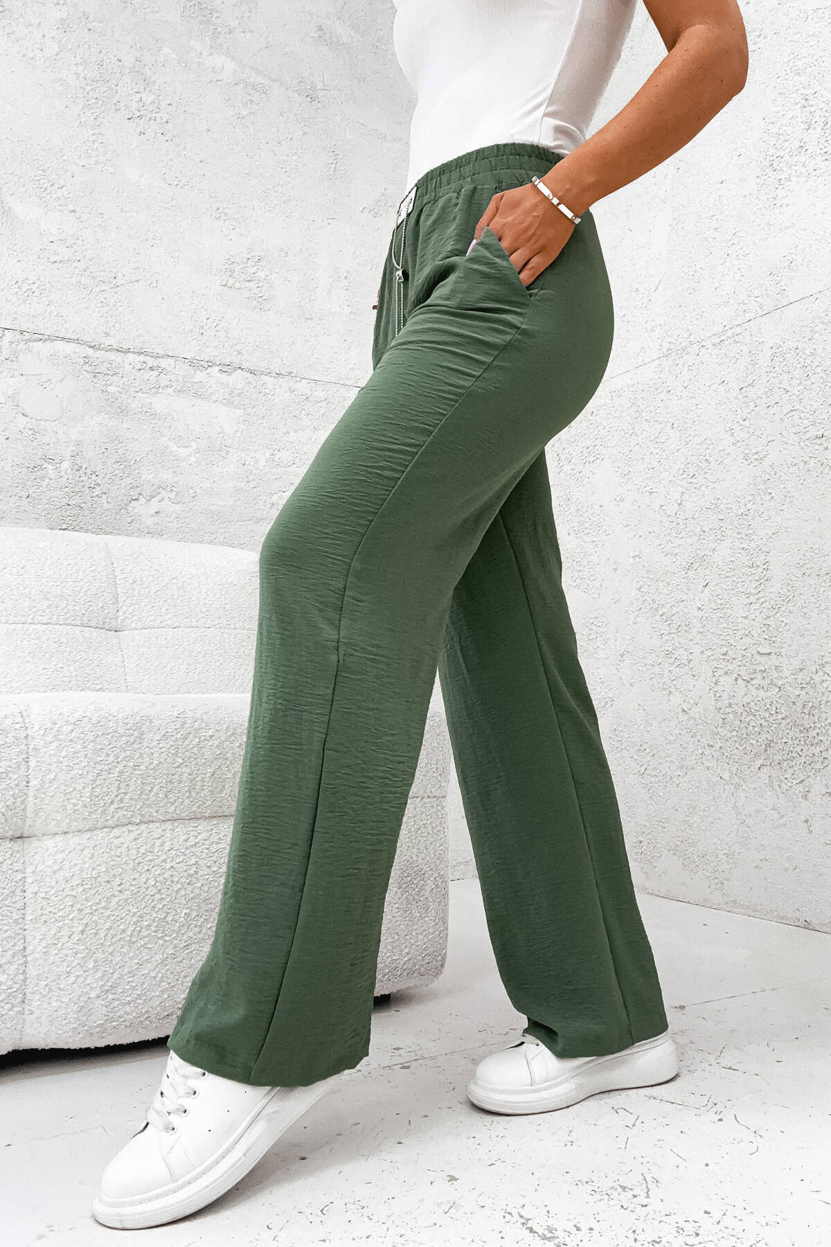 SPODNIE MATERIAŁOWE Z SZEROKĄ NOGAWKĄ I ŁAŃCUSZKIEM W PASIE- ZIELONE