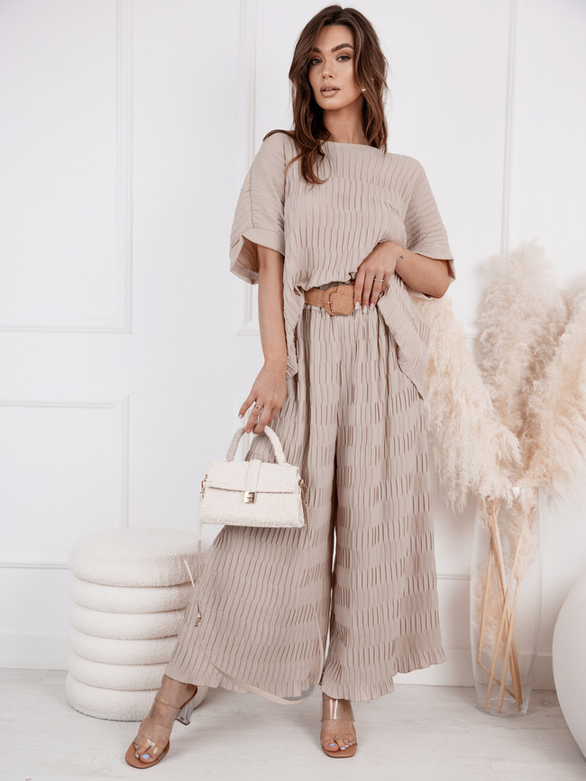 KARBOWANY KOMPLET SZEROKIE SPODNIE Z PASKIEM+ BLUZKA- BEŻOWY