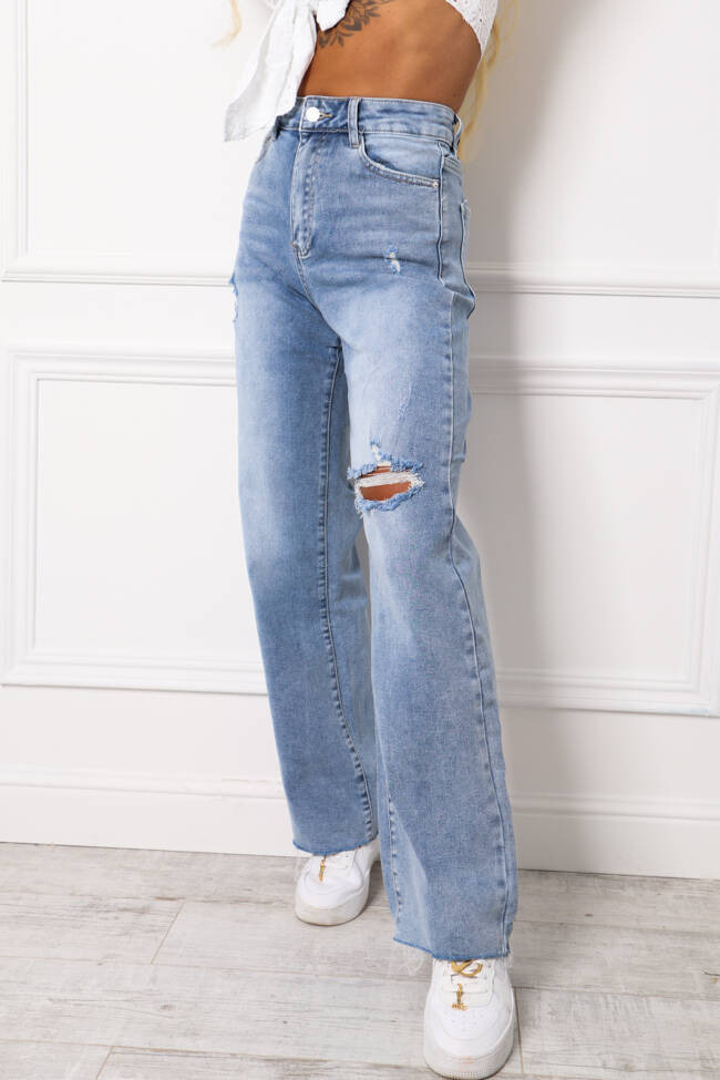 SZEROKIE SPODNIE JENASOWE Z DZIURA I SUROWĄ NOGAWKĄ