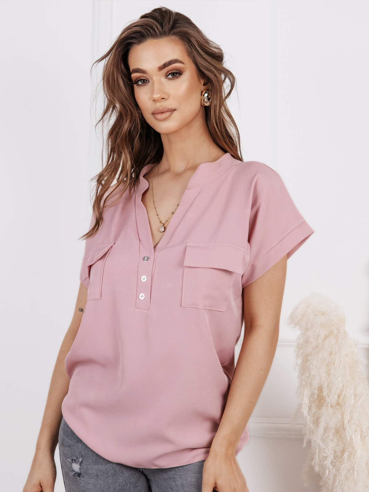 BLUZKA KOSZULOWA Z GUZIKAMI I KIESZONKAMI- PUDROWY RÓŻ
