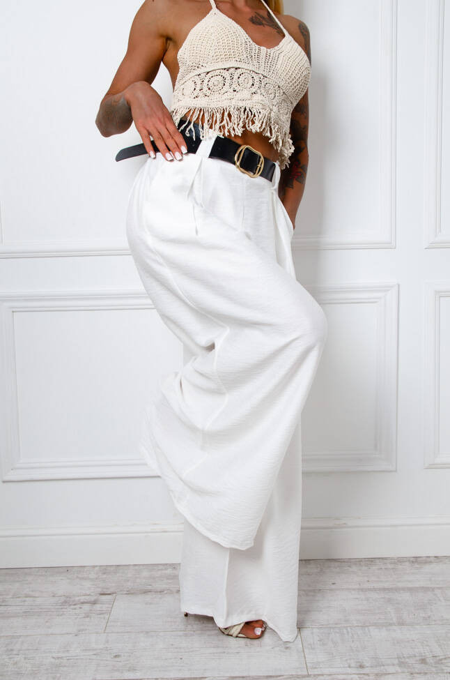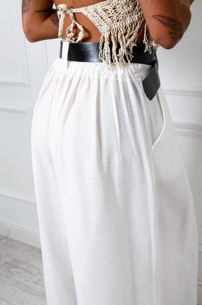 SZEROKIE SPODNIE ONE SIZE Z KIESZENIAMI I PASKIEM- BIAŁE