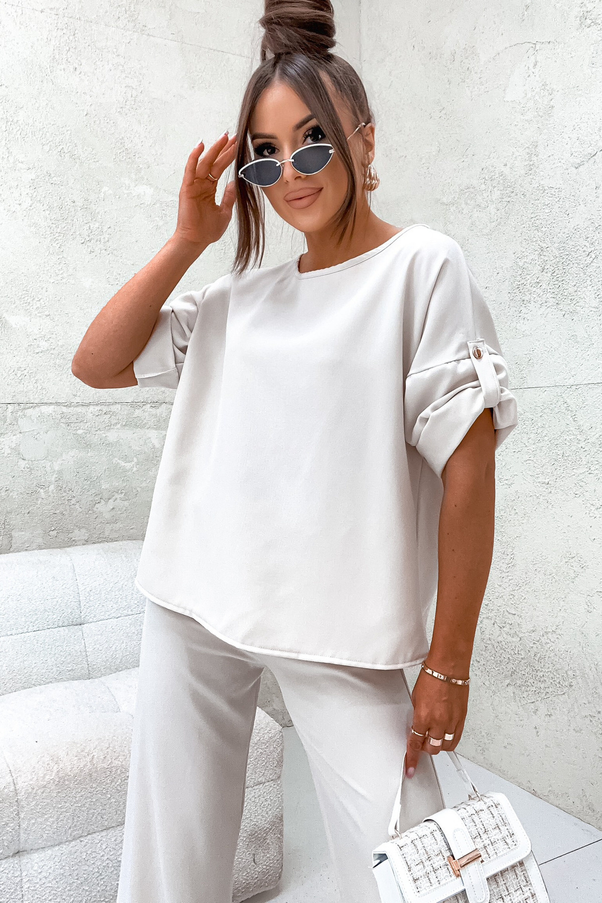 JASNO BEŻOWY KOMPLET SZEROKIE SPODNIE+ BLUZKA Z GUZIKAMI NA RĘKAWACH