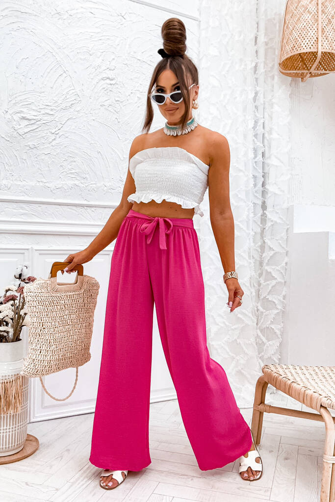 SPODNIE SZEROKIE Z GUMĄ I WIĄZANIEM W PASIE- CIEMNO RÓŻOWE