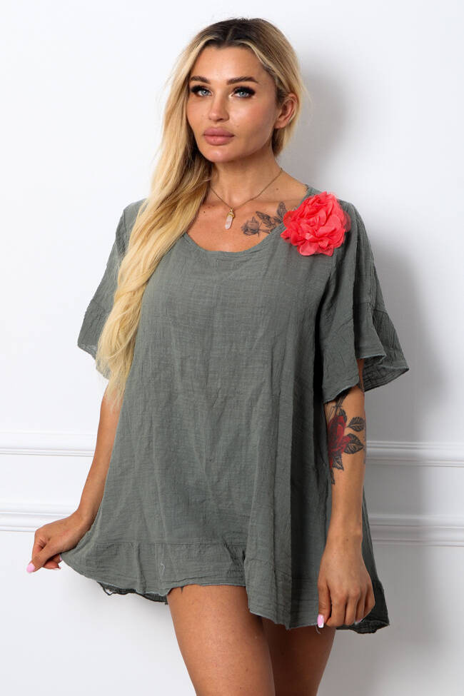 ASYMETRYCZNA BLUZKA Z LNU+ OZDOBNY KWIAT- KHAKI