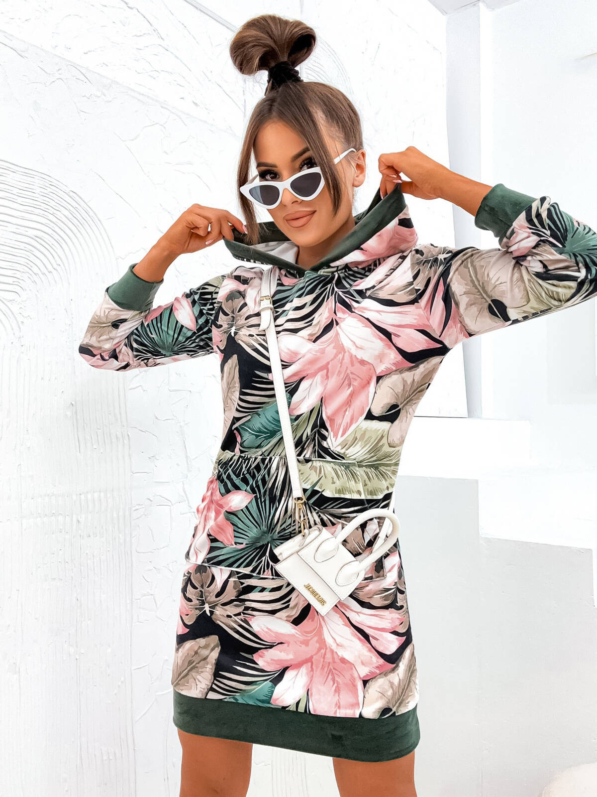 SUKIENKA WELUROWA W KWIATY Z KAPTUREM-ZIELONA