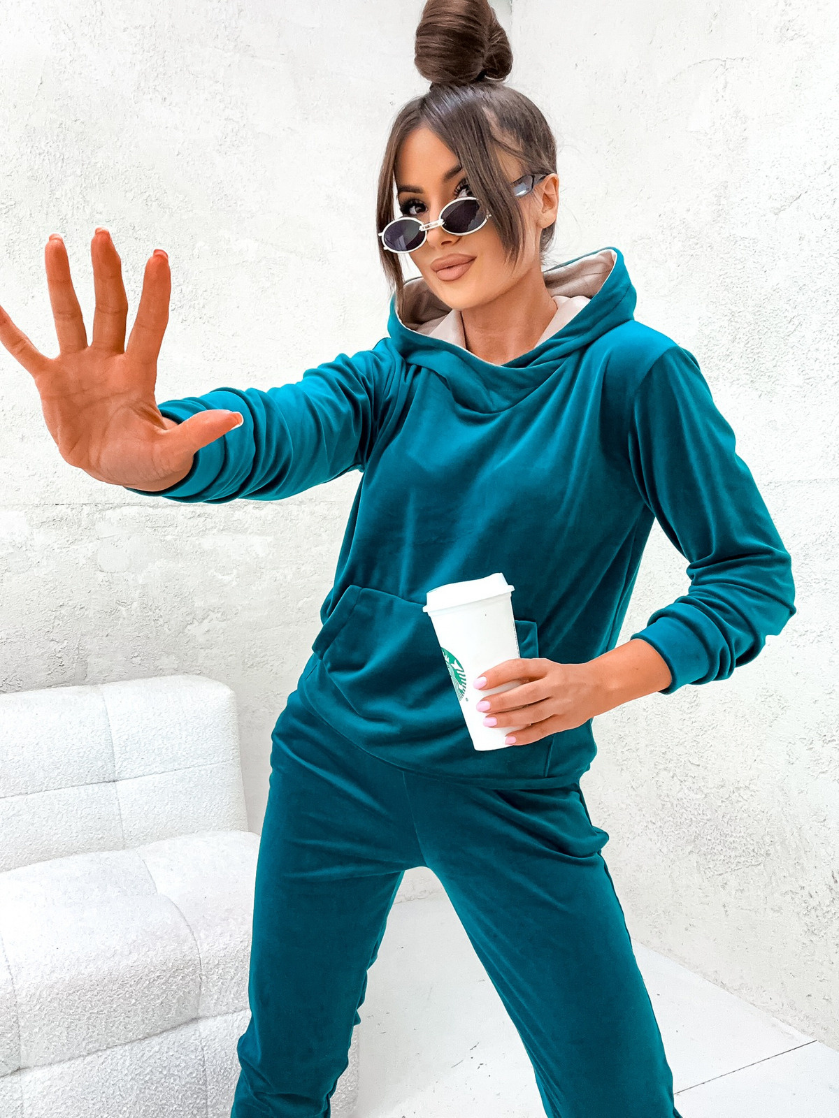 WELUROWY KOMPLET DRESOWY BLUZA Z KAPTUREM+ SPODNIE- MORSKI