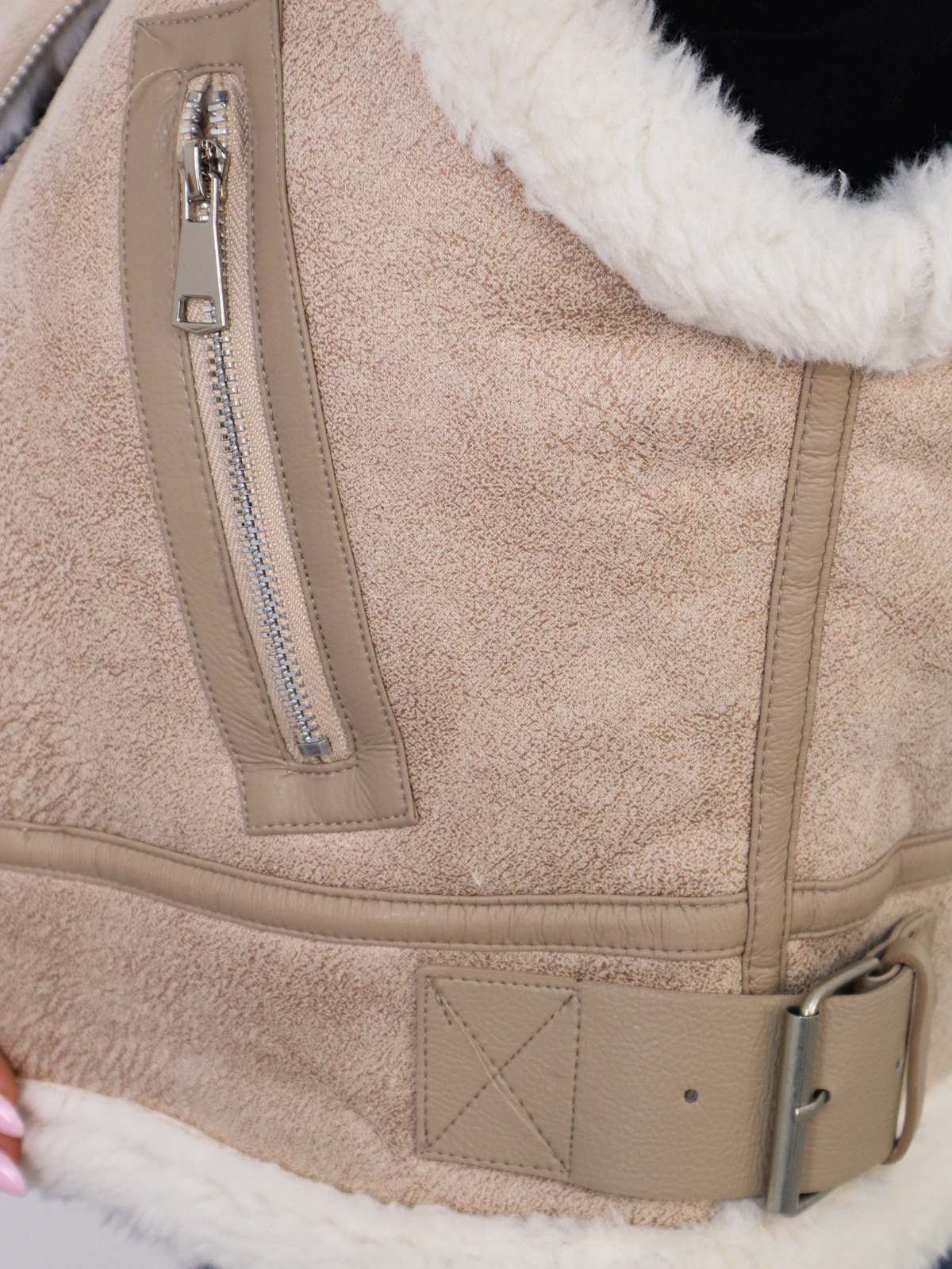 KRÓTKA KAMIZELKA BEZRĘKAWNIK Z KOŻUSZKIEM- BEŻOWA