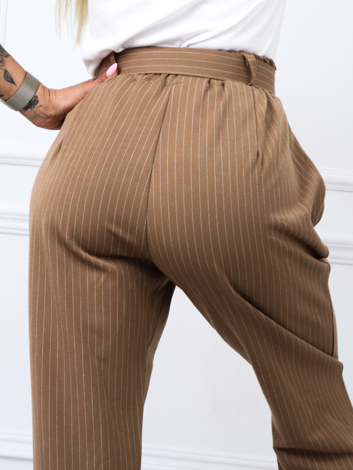 ELGANCKIE SPODNIE W PASKI Z PROSTĄ NOGAWKĄ + PASEK- BRĄZOWE