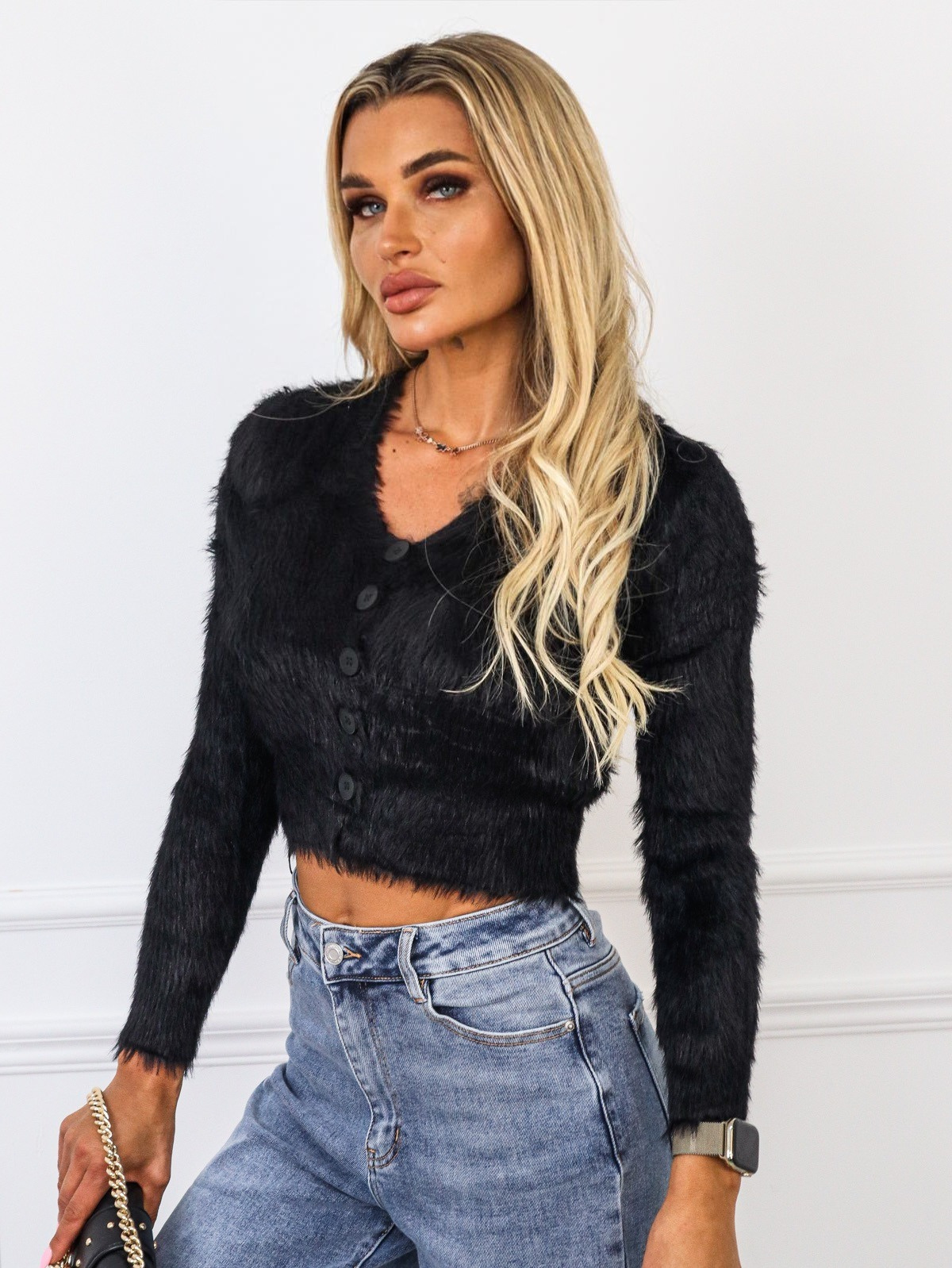 FUTRZANY SWETER ZAPINANY NA GUZIKI- CZARNY