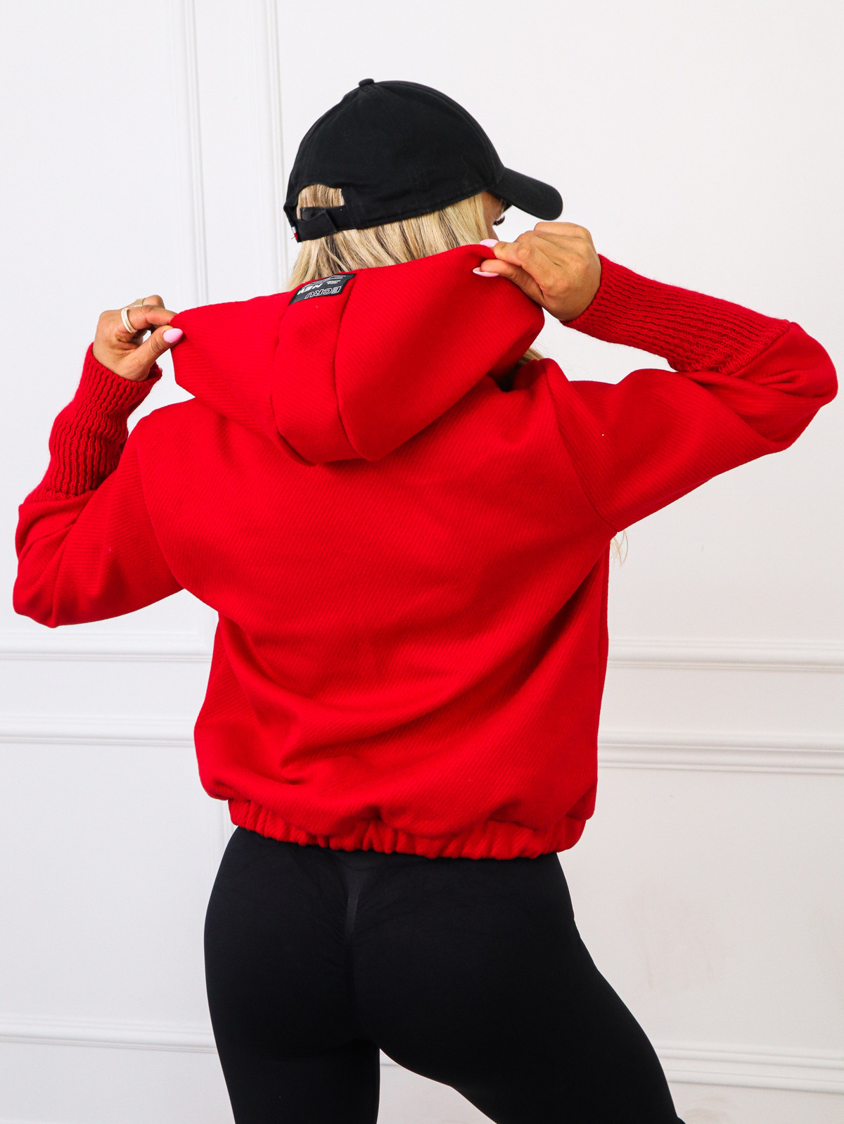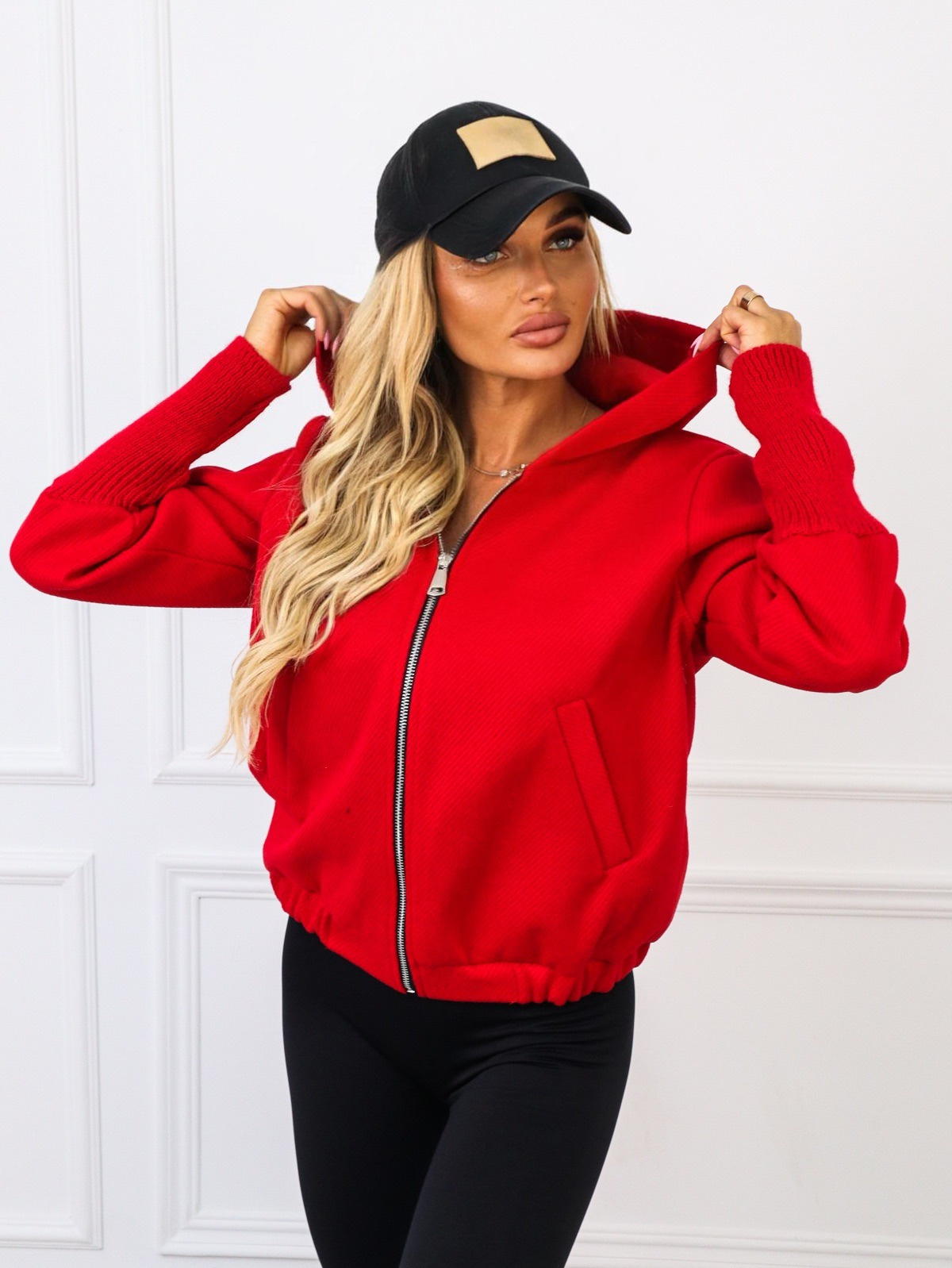 KURTKA Z KAPTUREM I DŁUGIM ŚCIAGACZEM NA RĘKAWIE- CZERWONA