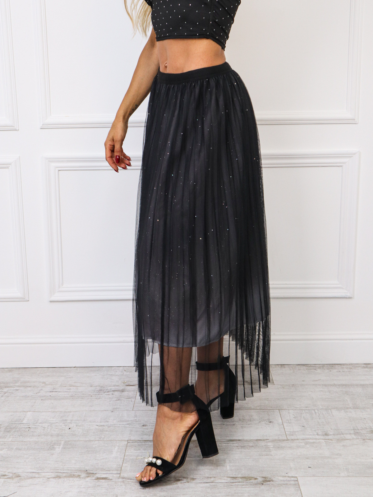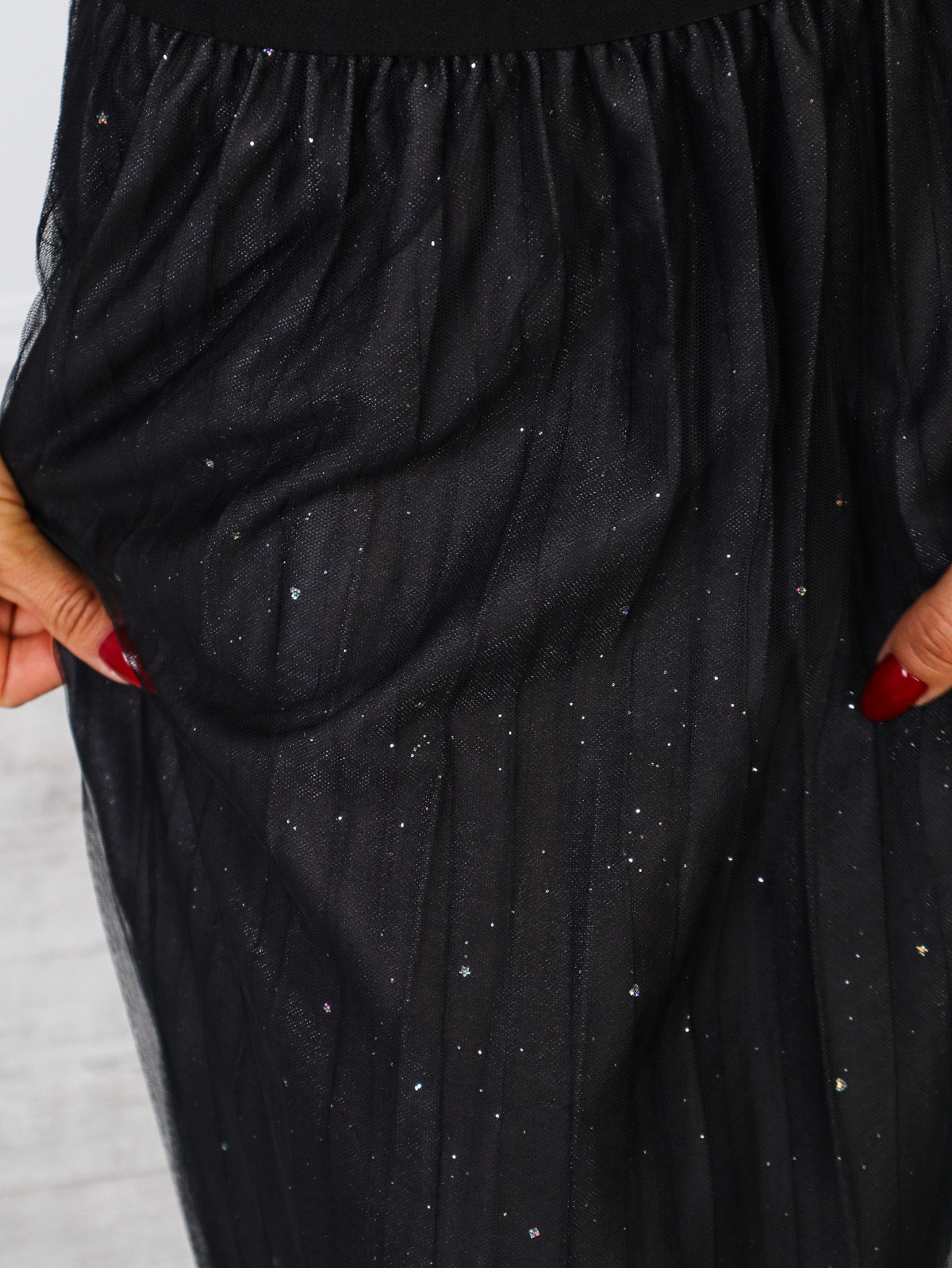 BŁYSZCZĄCA TIULOWA SPÓDNICA MIDI- CZARNA