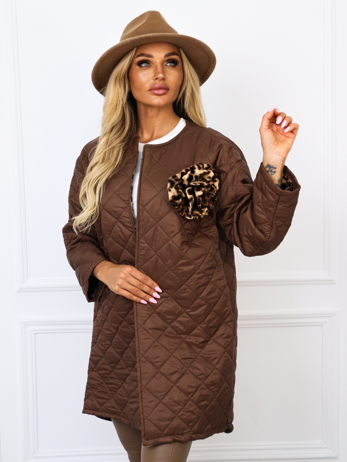 Długa, pikowana kurtka z panterkowym obszyciem od wewnątrz. Model z obniżoną linią ramion posiada ozdobną broszkę w kształcie róży.