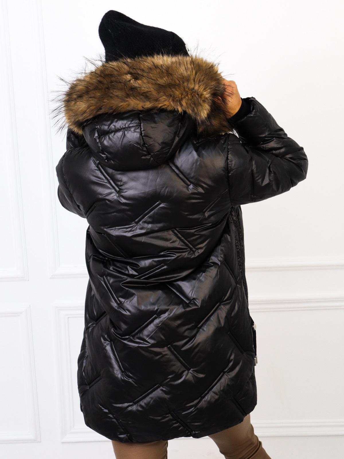 Asymetryczna, pikowana kurtka. Po bokach ściągacze. Odpinane futerko przy kapturze.