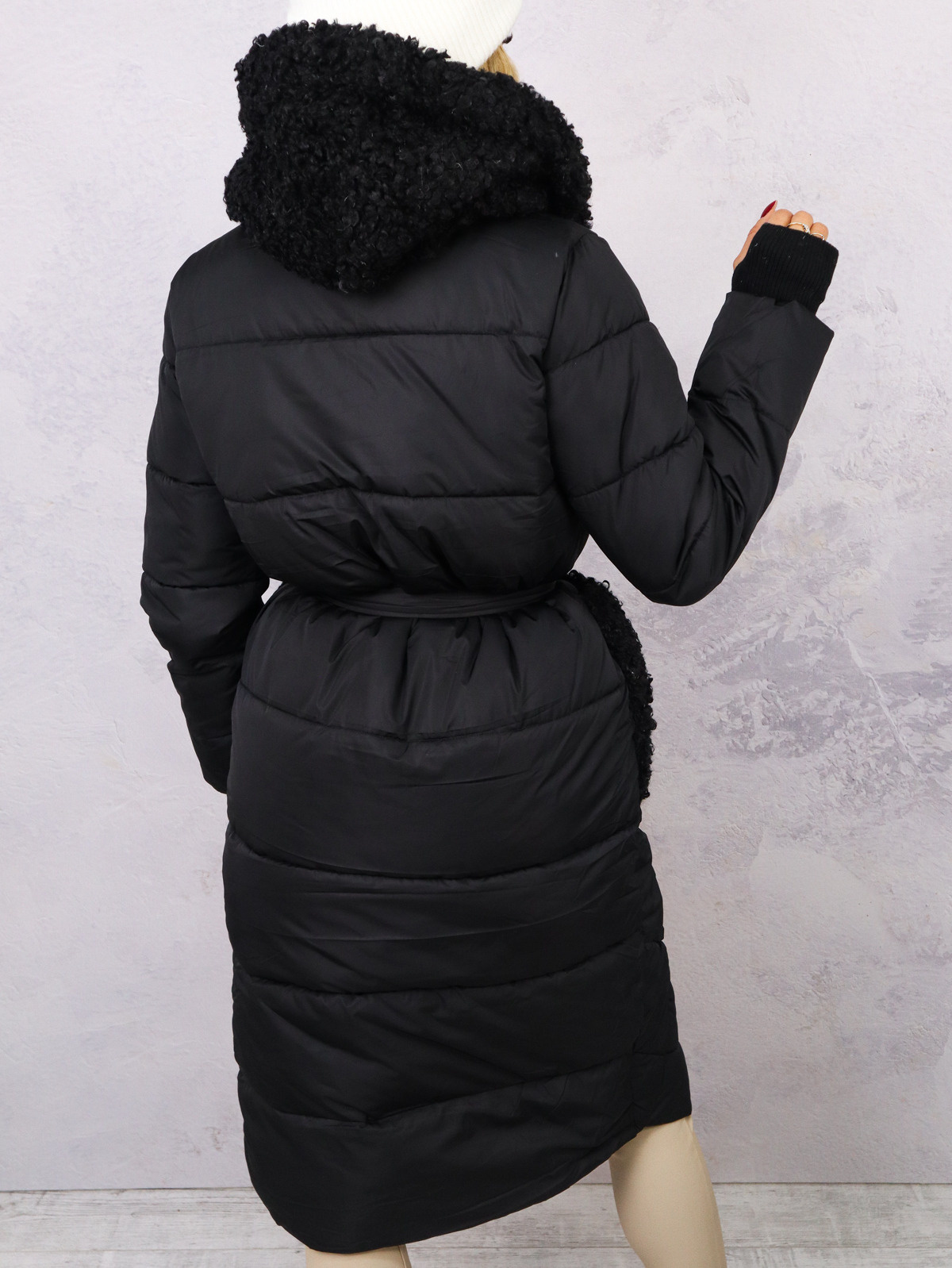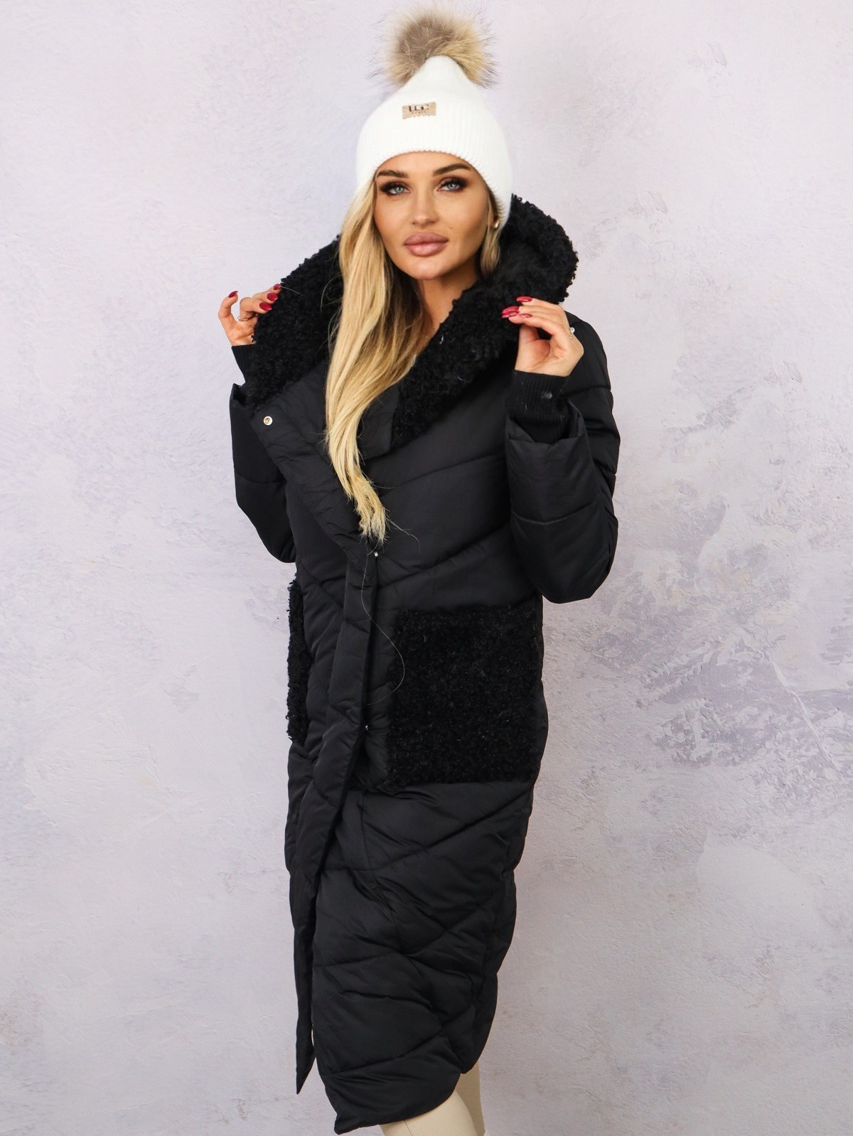DŁUGA KURTKA Z FUTRZANYM KAPTUREM I KIESZENIAMI- CZARNA