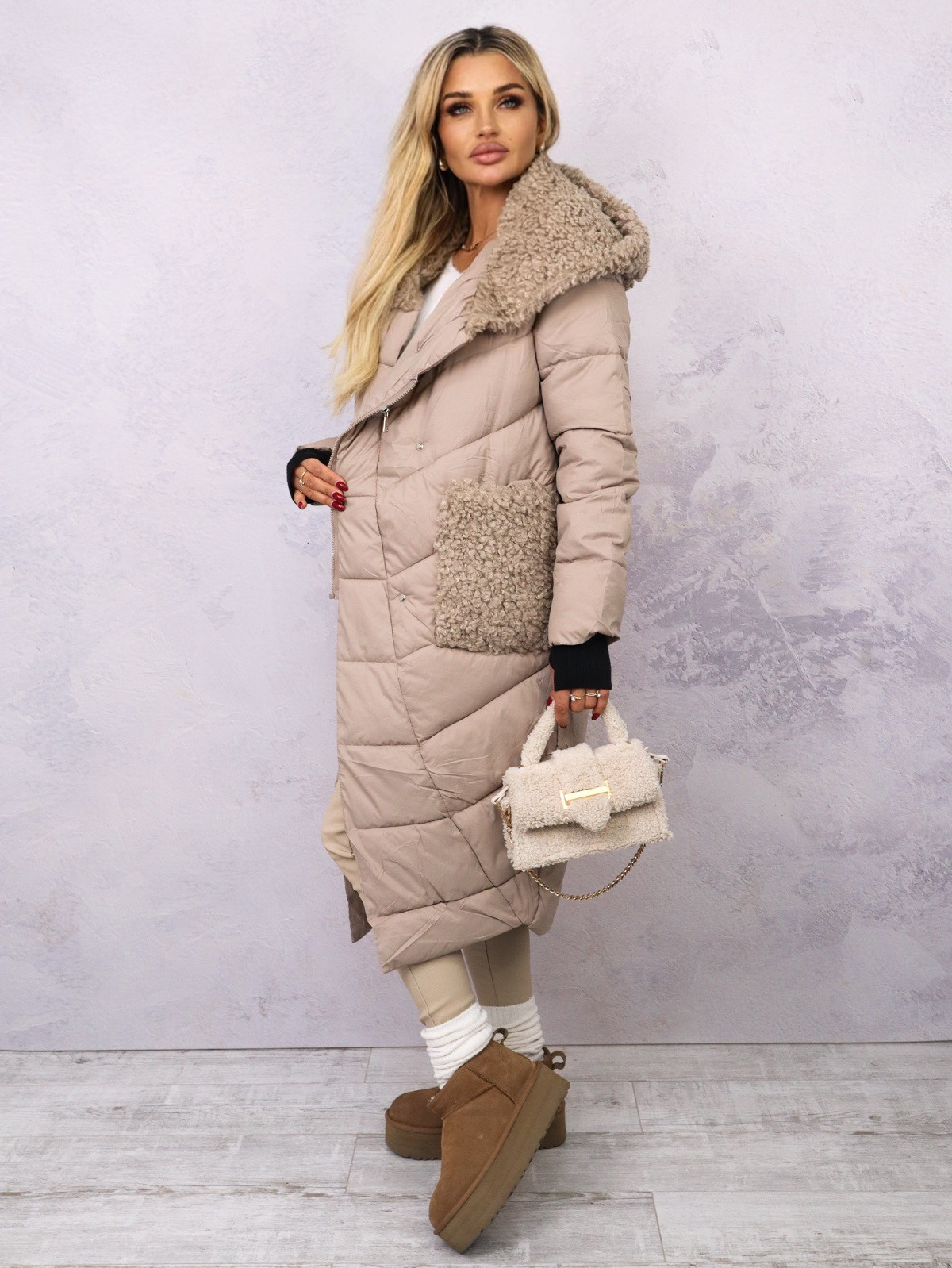 Długa, puchowa kurtka zapinana na zamek i zatrzaski. Futrzane, ozdobne kieszenie i futrzany kaptur. Długie ściągacze przy rękawach.