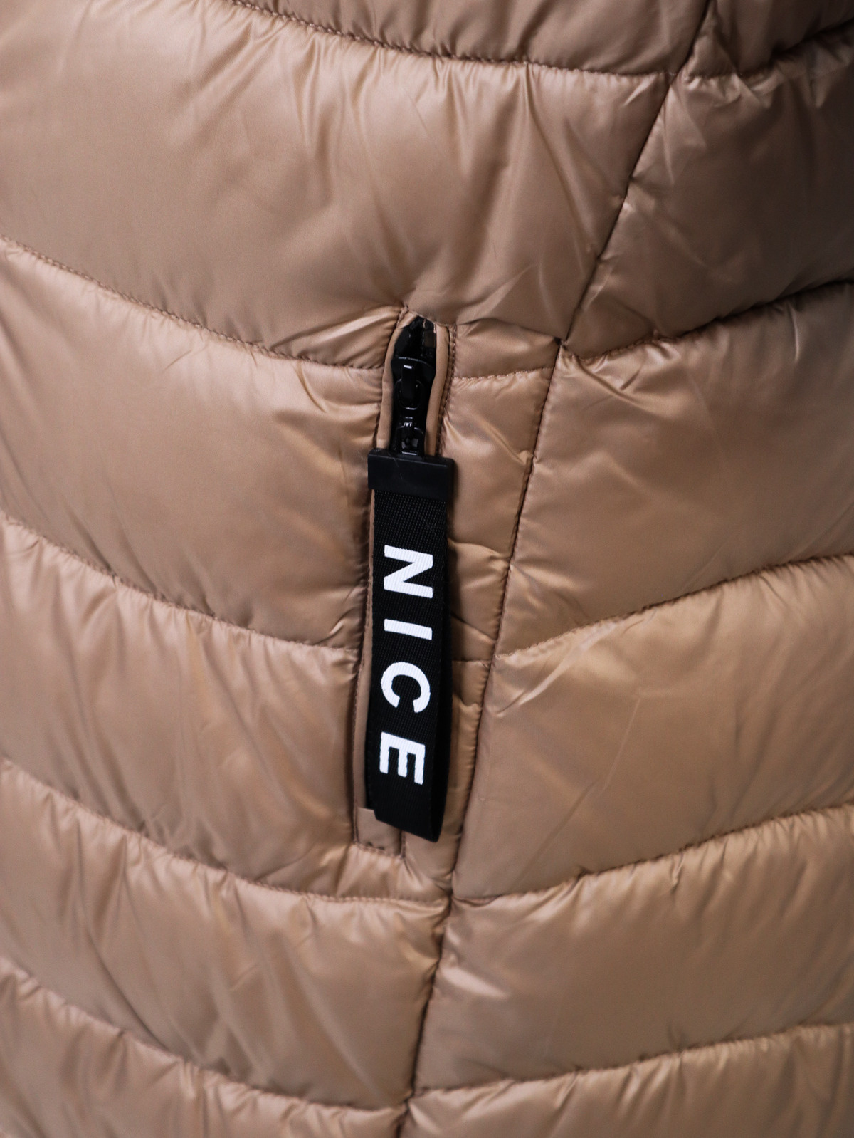 Długa, pikowana kurtka z kapturem. Ozdobne taśmy z napisem przy zamkach. Ściągacze przy rękawach, odpinane futro przy kapturze.