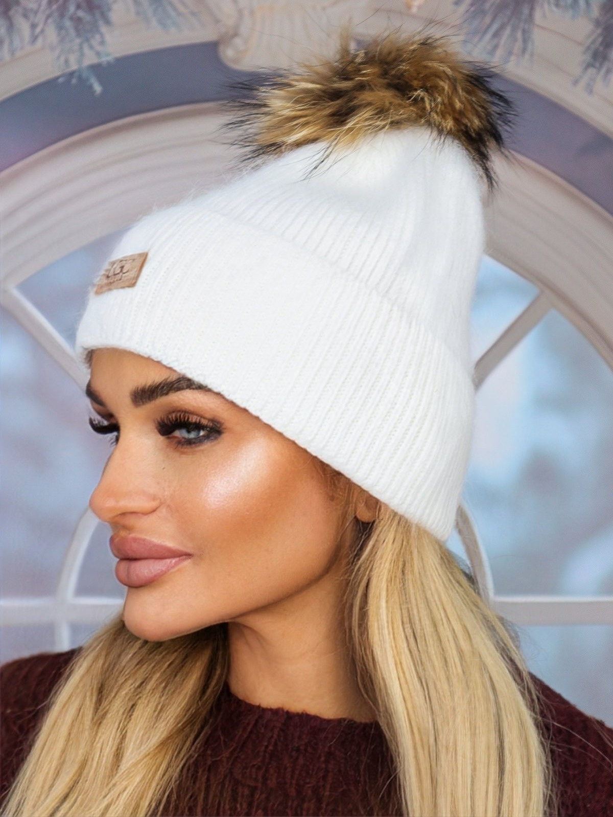 ZIMOWA CZAPKA Z POMPONEM I NASZYWKĄ- BIAŁA