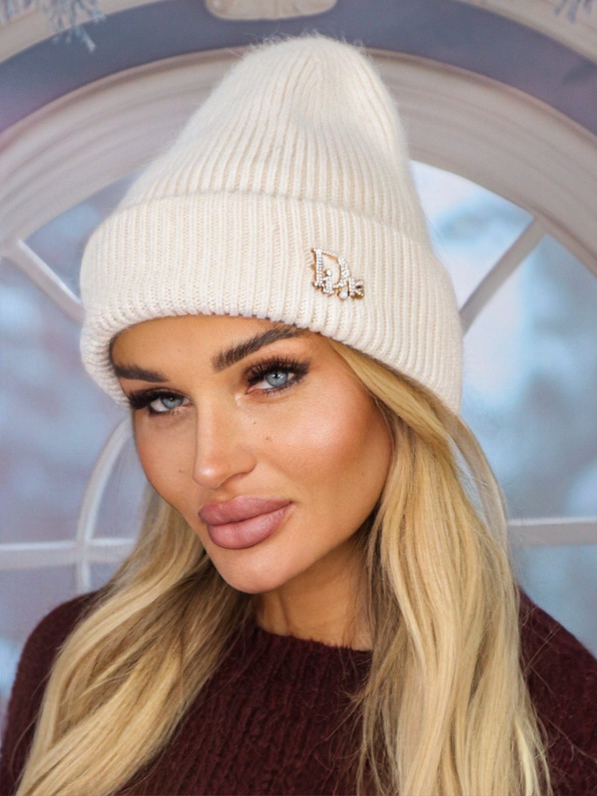 CZAPKA ZIMOWA Z BROSZKĄ W CYRKONIE DiK- BEŻOWA