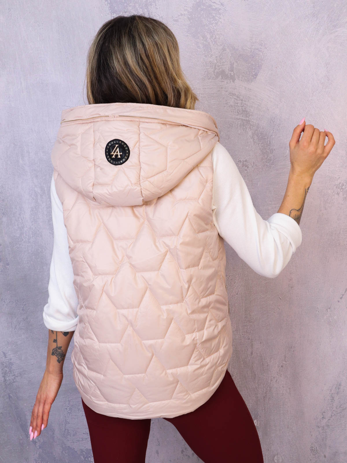 KAMIZELKA ASYMETRYCZNA Z KONTRASTOWYM KAPTUREM- BEŻOWA