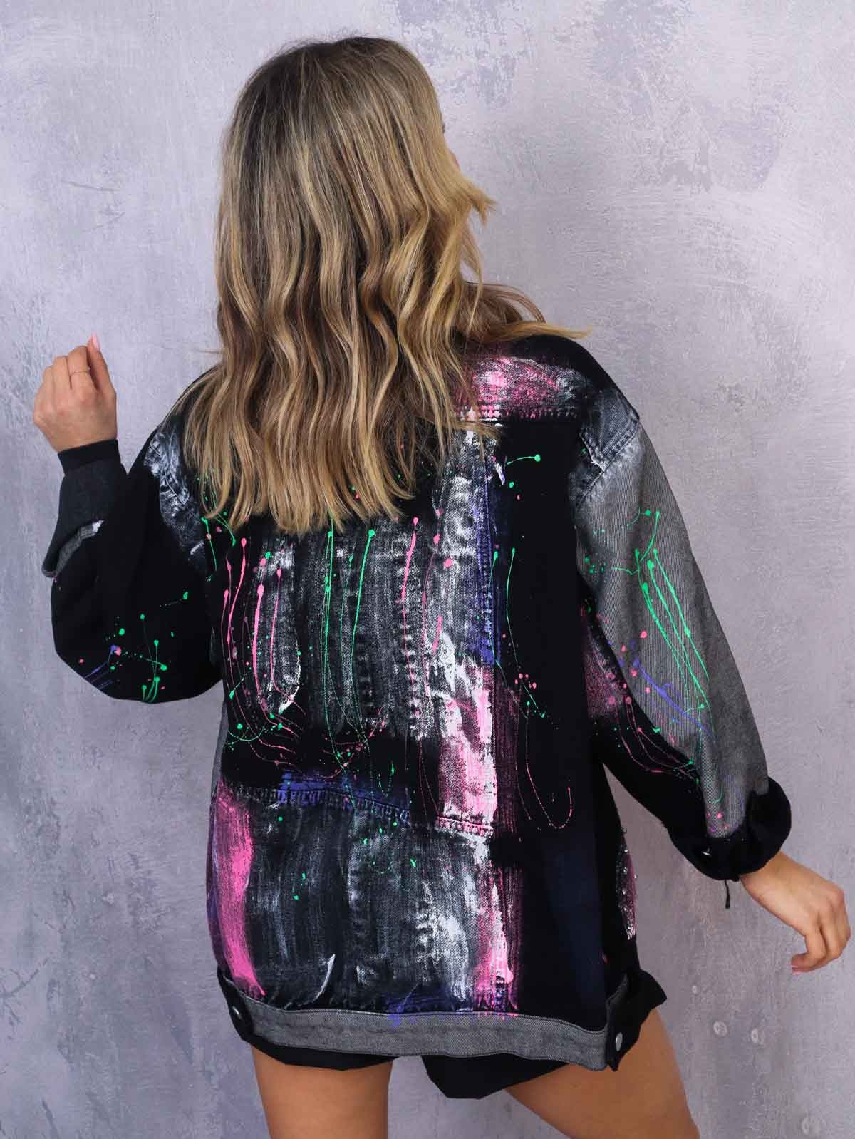 KURTKA JEANSOWA W KOLOROWE WZORY ZDOBIONA KRYSZTAŁKAMI- CZARNA
