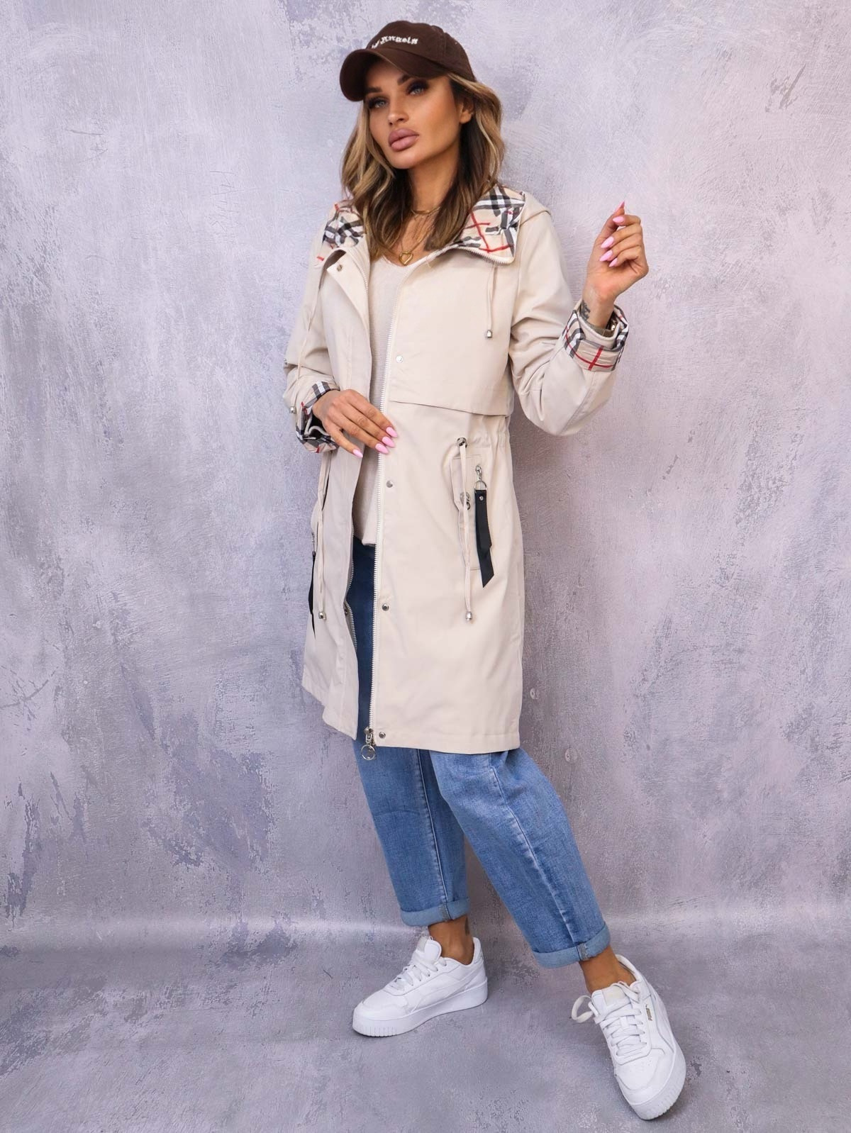 KURTKA PARKA Z KAPTUREM W KRATĘ- JASNOBEŻOWA