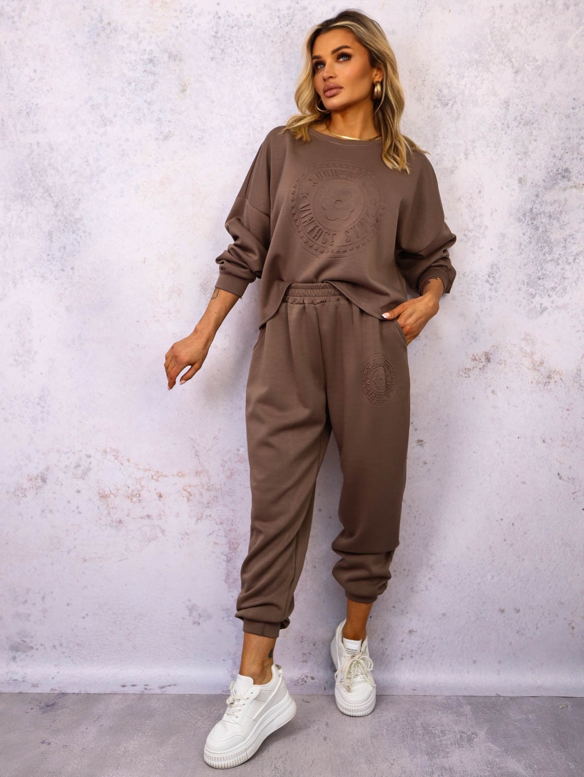 KOMPLET DRESOWY BLUZA Z WYTŁOCZONYM NADRUKIEM+ SPODNIE- BRĄZOWY
