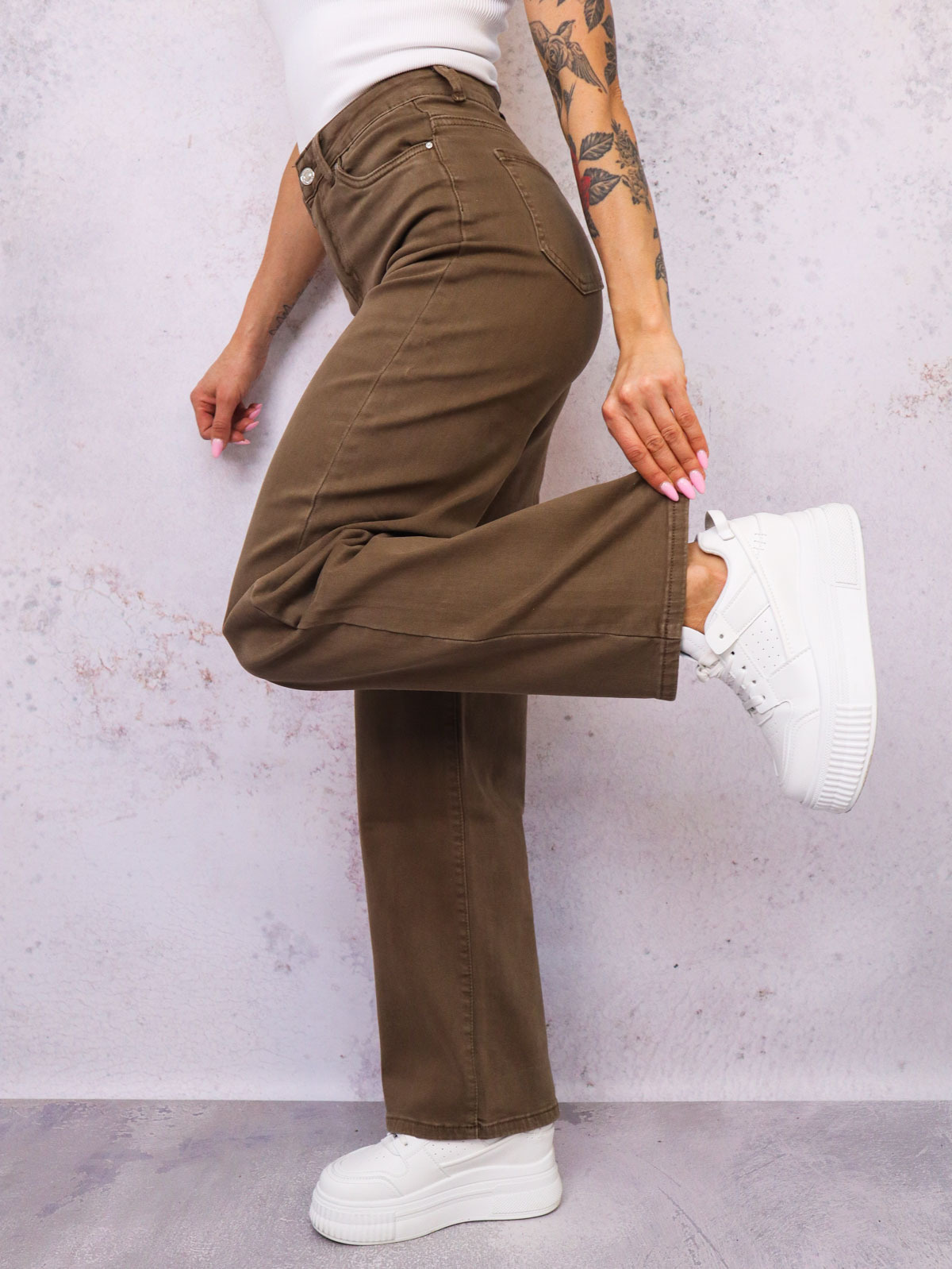CIEMNOBRĄZOWE SPODNIE JEANSOWE Z SZEROKIMI NOGAWKAMI