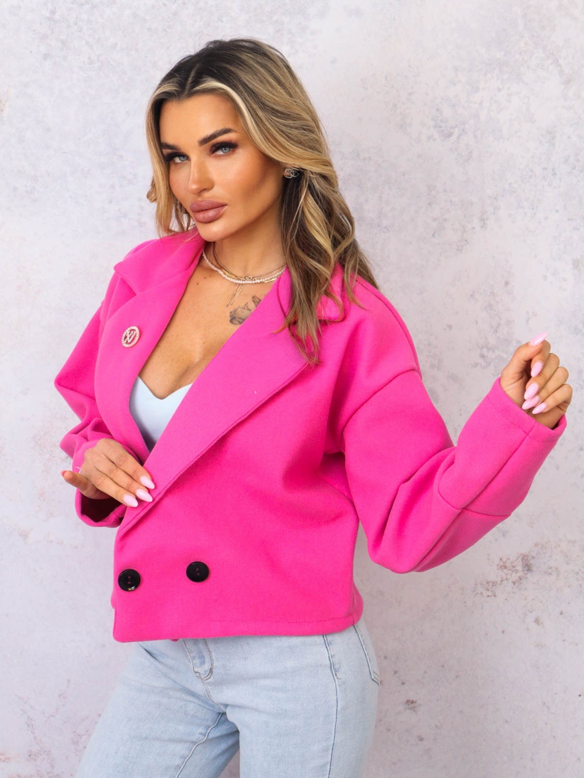 KRÓTKI PŁASZCZ Z KOŁNIERZEM I OZDOBNĄ BROSZKĄ- RÓŻOWY