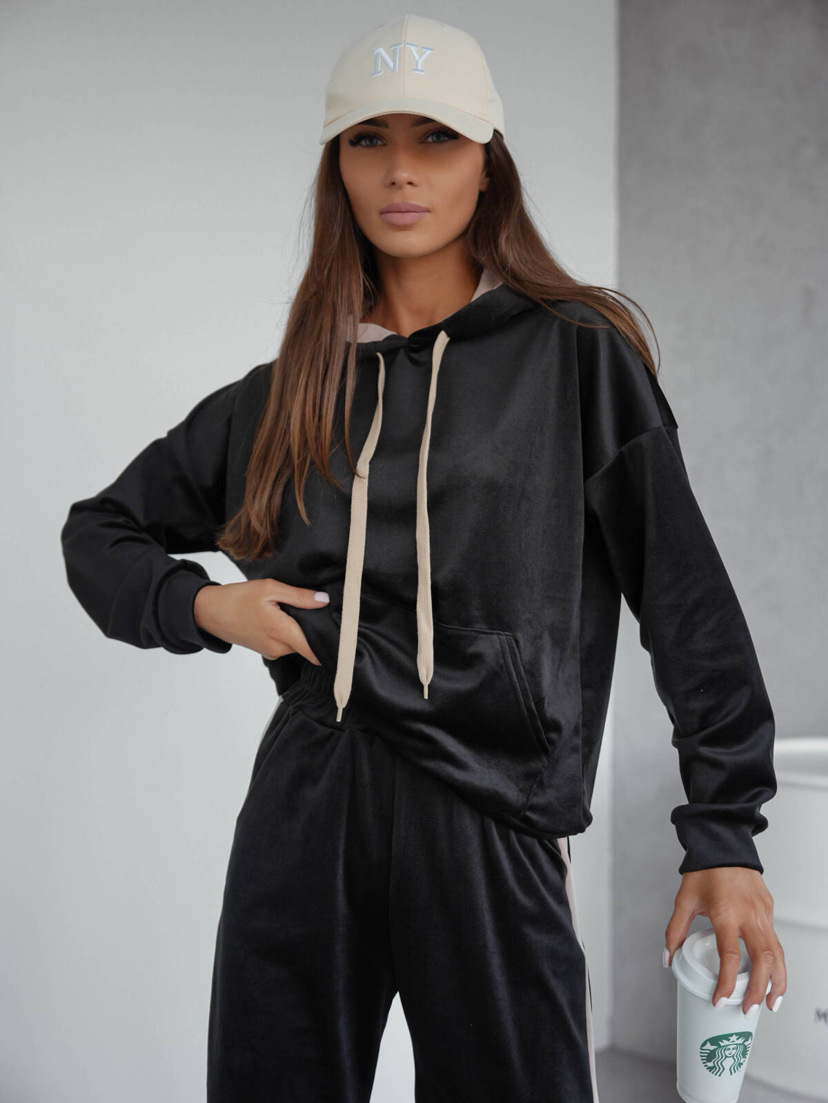 Komplet dresowy, welurowy, dwuczęściowy. Bluza z kontrastowym kapturem i sznurkami. Z przodu kieszeń kangurka. Rękawy i bluza zakończone ściągaczem. Spodnie z gumą w pasie zakończone ściągaczem. Posiadają kontrastowe lampasy po bokach.