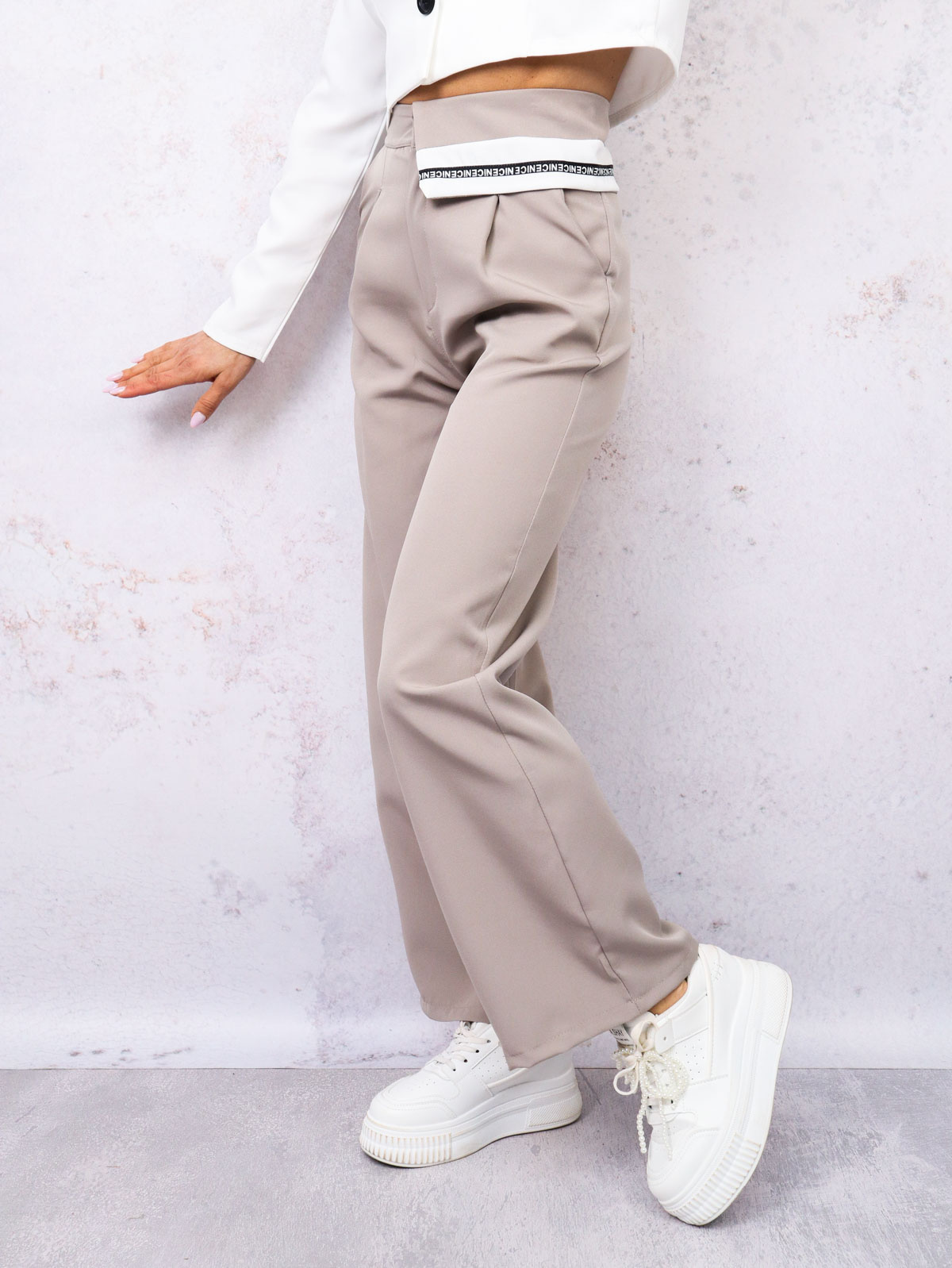 Spodnie materiałowe, eleganckie z szerokimi nogawkami. W pasie ozdobny mankiet.