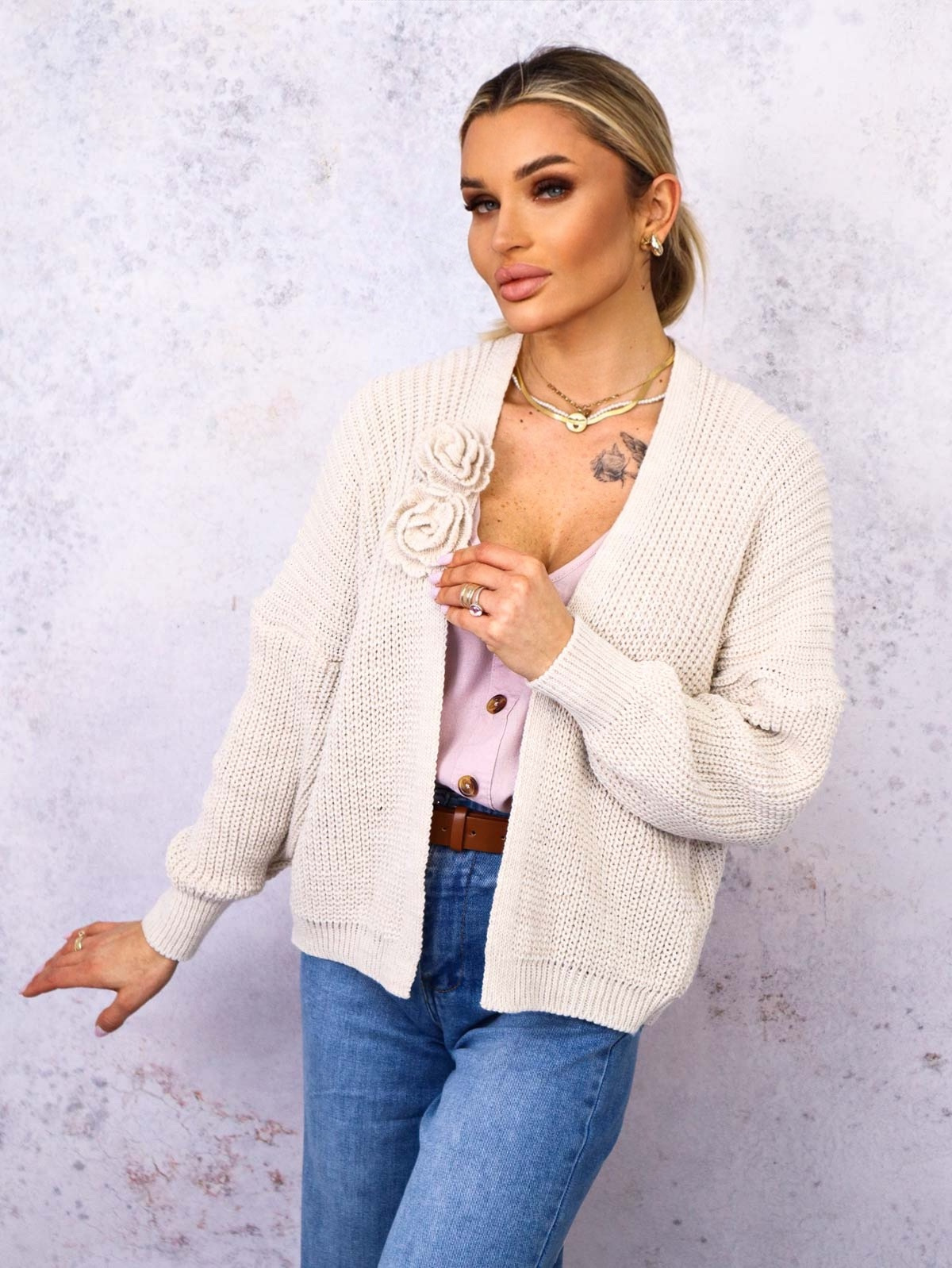 KRÓTKI KARDIGAN Z PRZYPINANYMI KWIATAMI- BEŻOWY