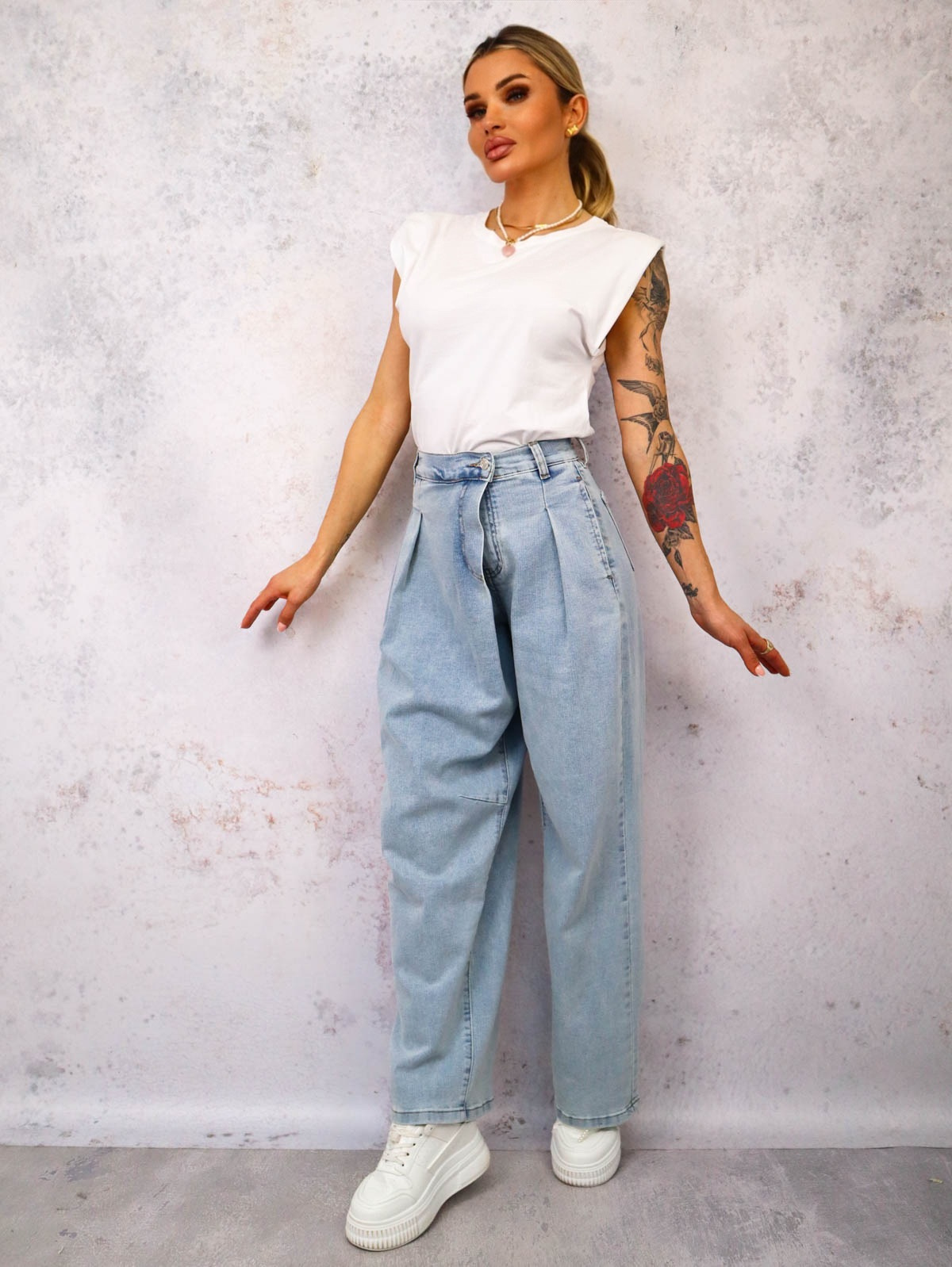 SPODNIE JEANSOWE Z SZEROKIMI NOGAWKAMI I ASYMETRYCZNYM ZAPIĘCIEM- JASNY JEANS