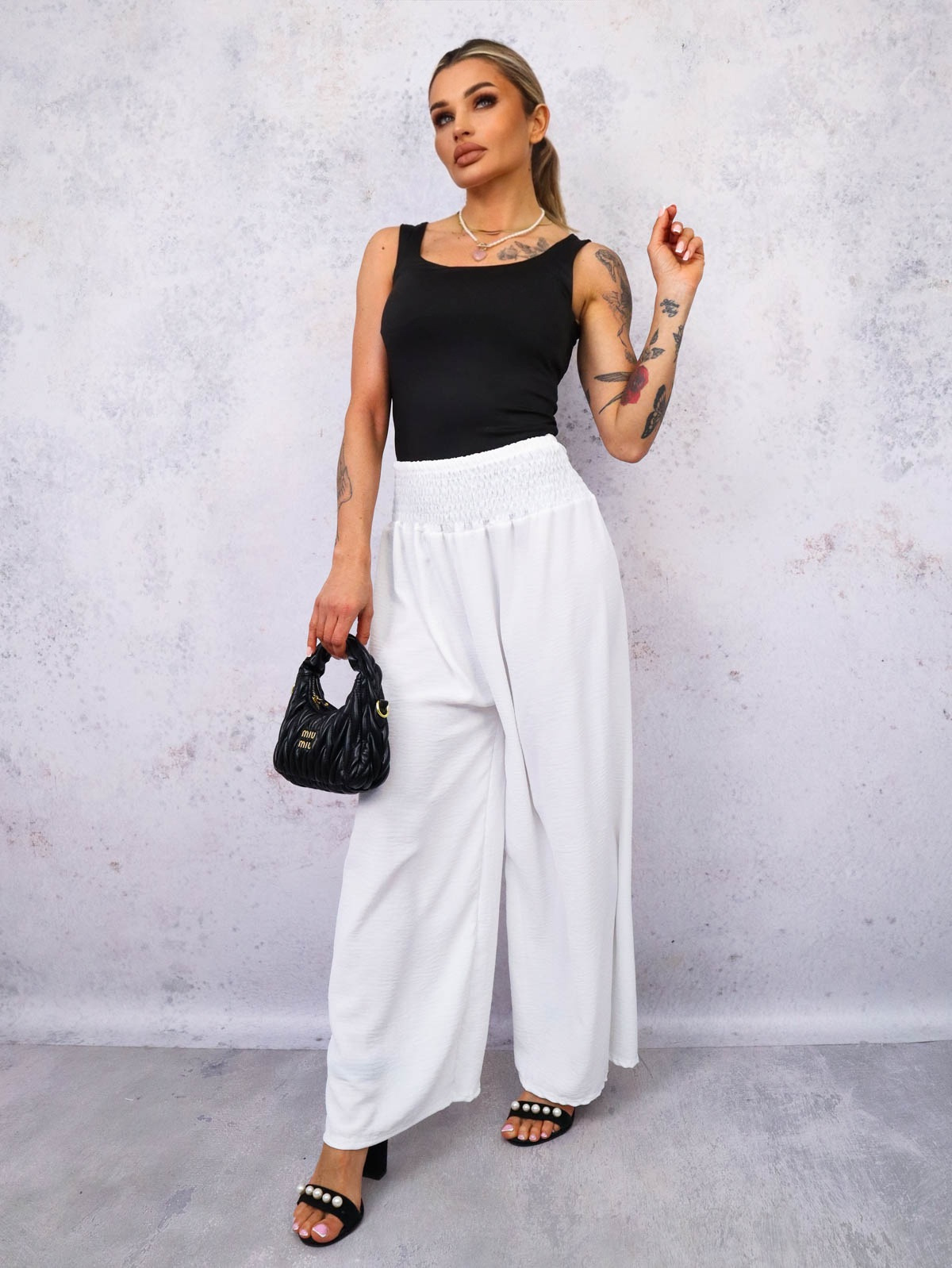 SPODNIE MATERIAŁOWE Z SZEROKIMI NOGAWKAMI I GUMĄ W PASIE- BIAŁE