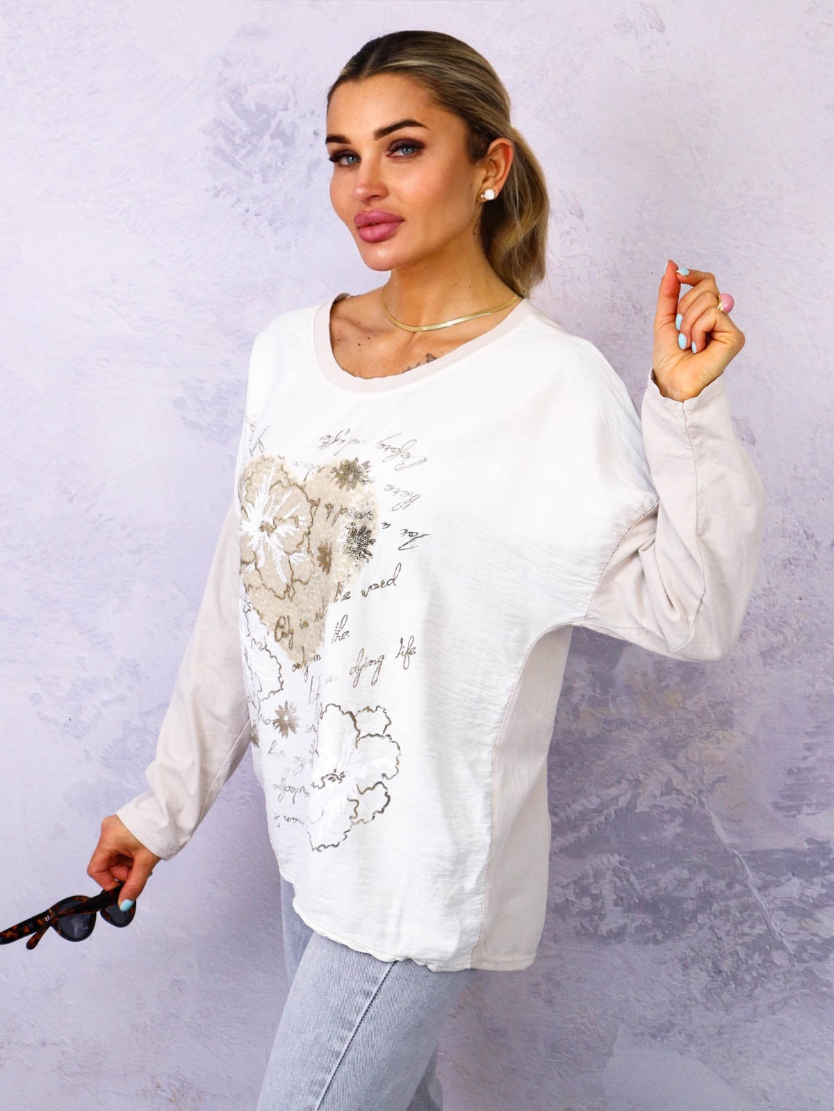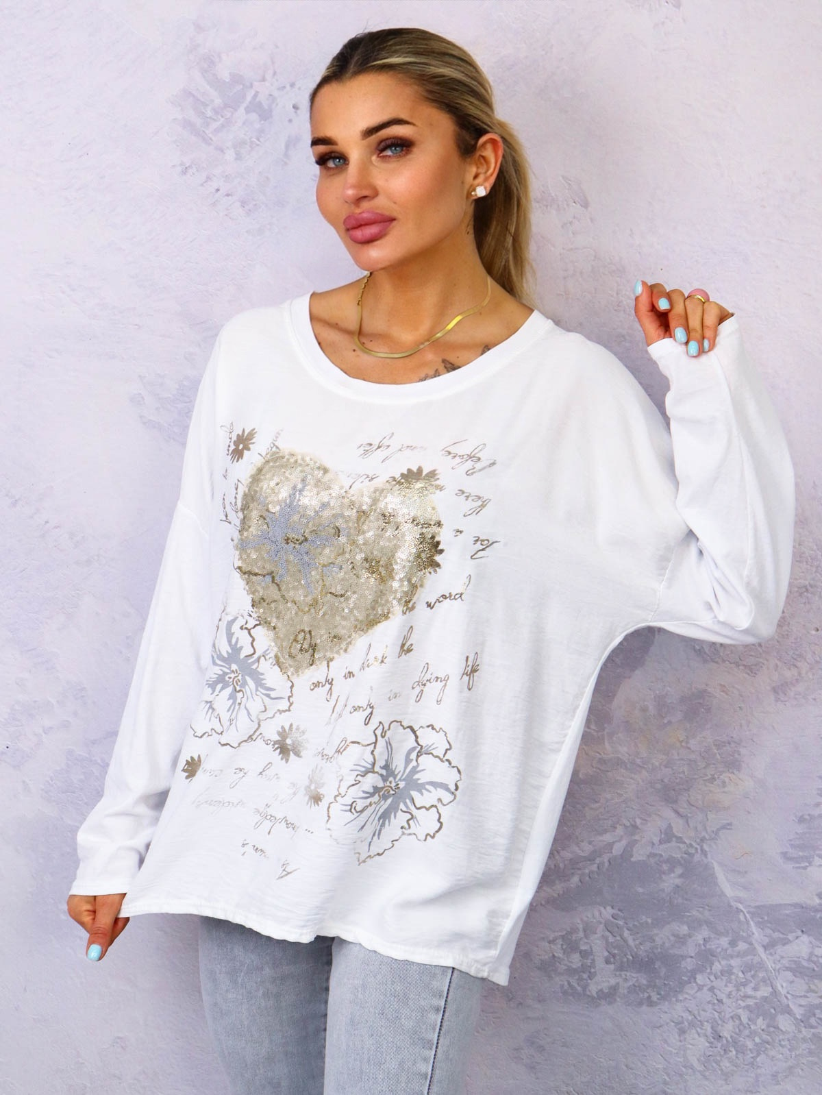Bluzka z kontrastowymi rękawami. Napisy i serce ozdobione cekinami z przodu.