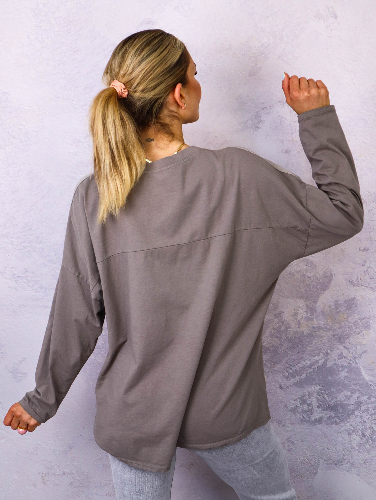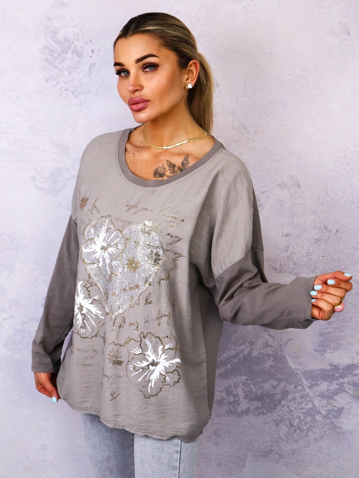 BLUZKA Z APLIKACJĄ I OZDOBNYMI CEKINAMI- SZARA