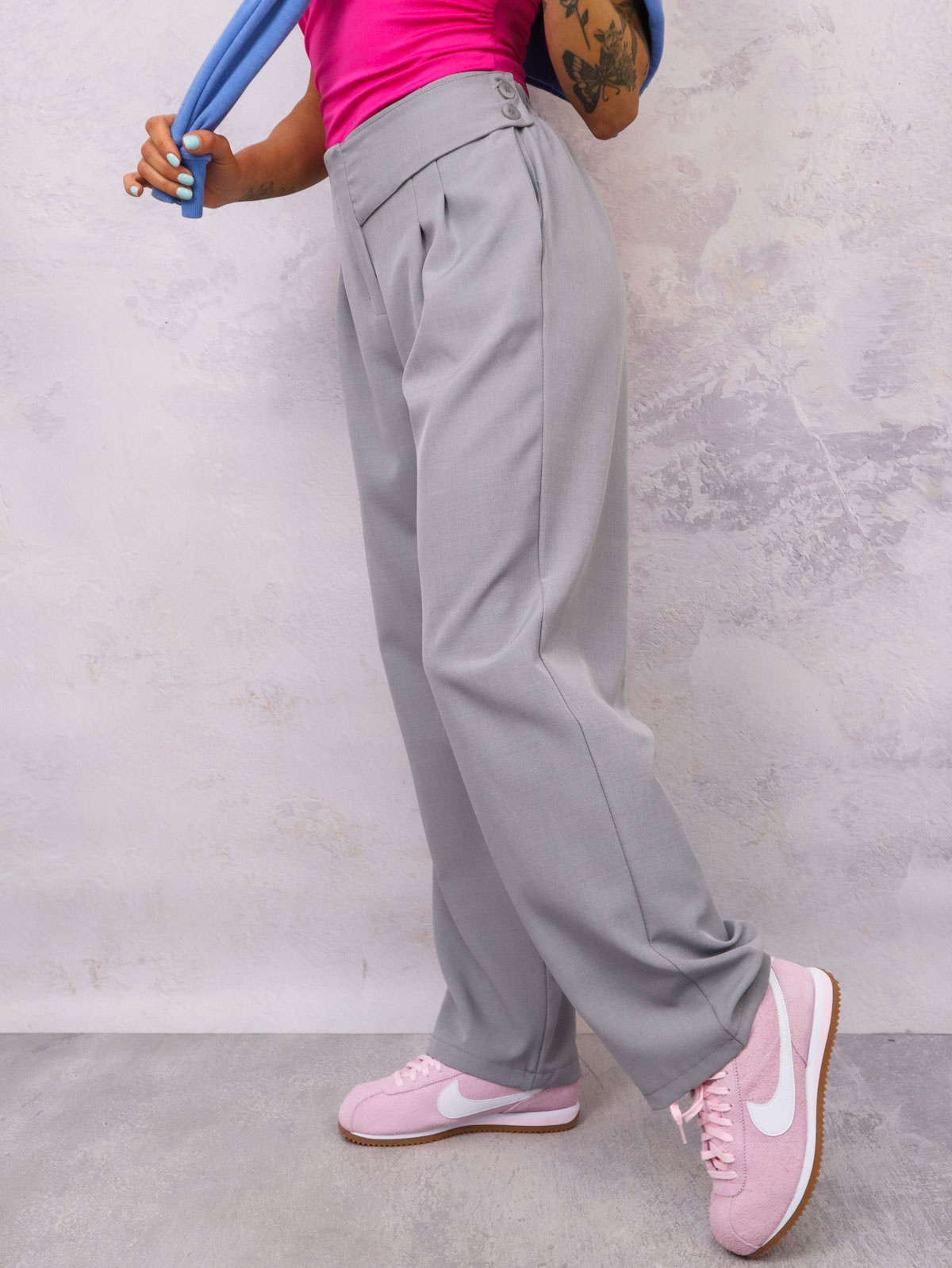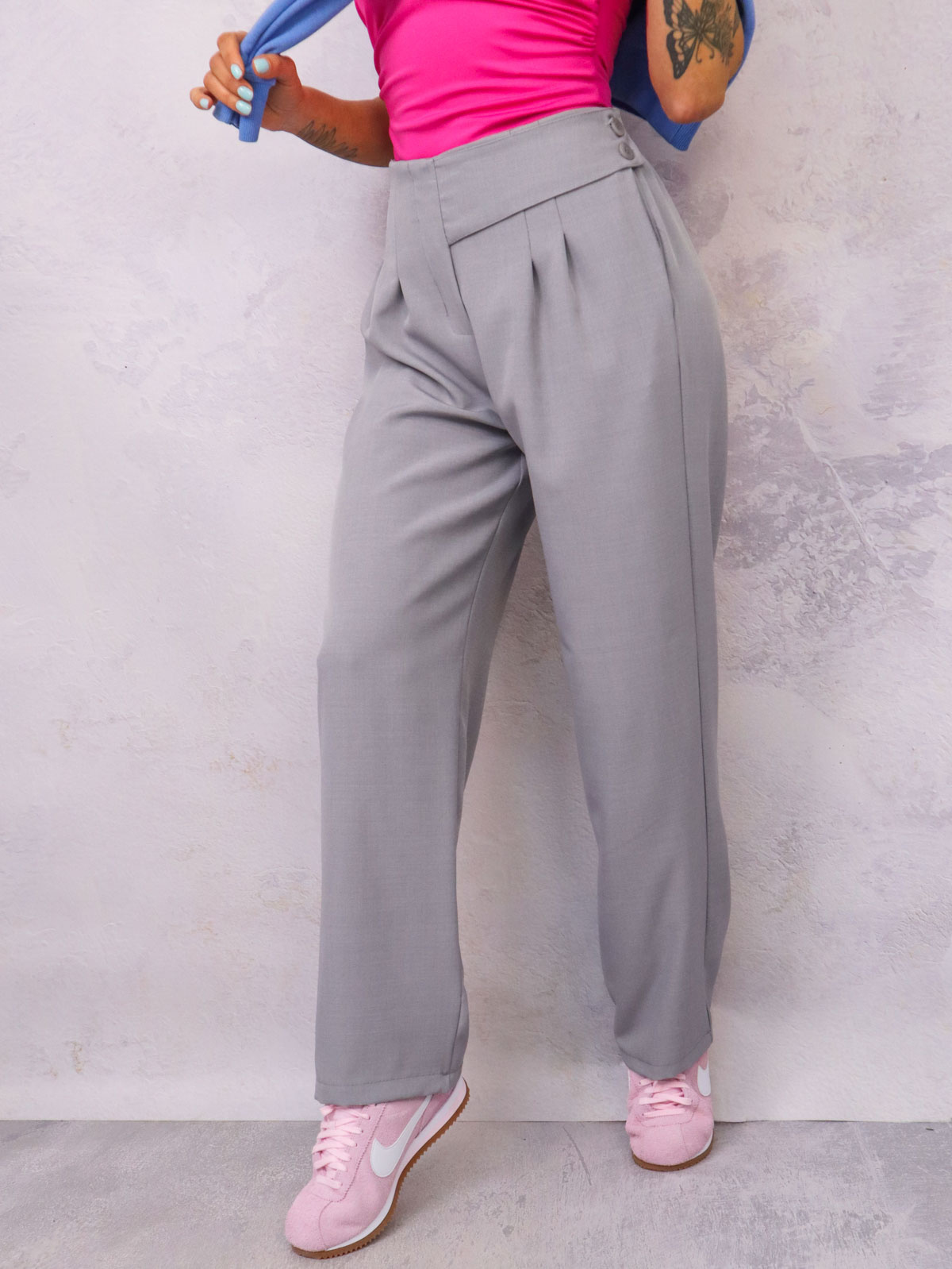 SPODNIE MATERIAŁOWE Z OZDOBNYM ZAPIĘCIEM NA BOKU- SZARE