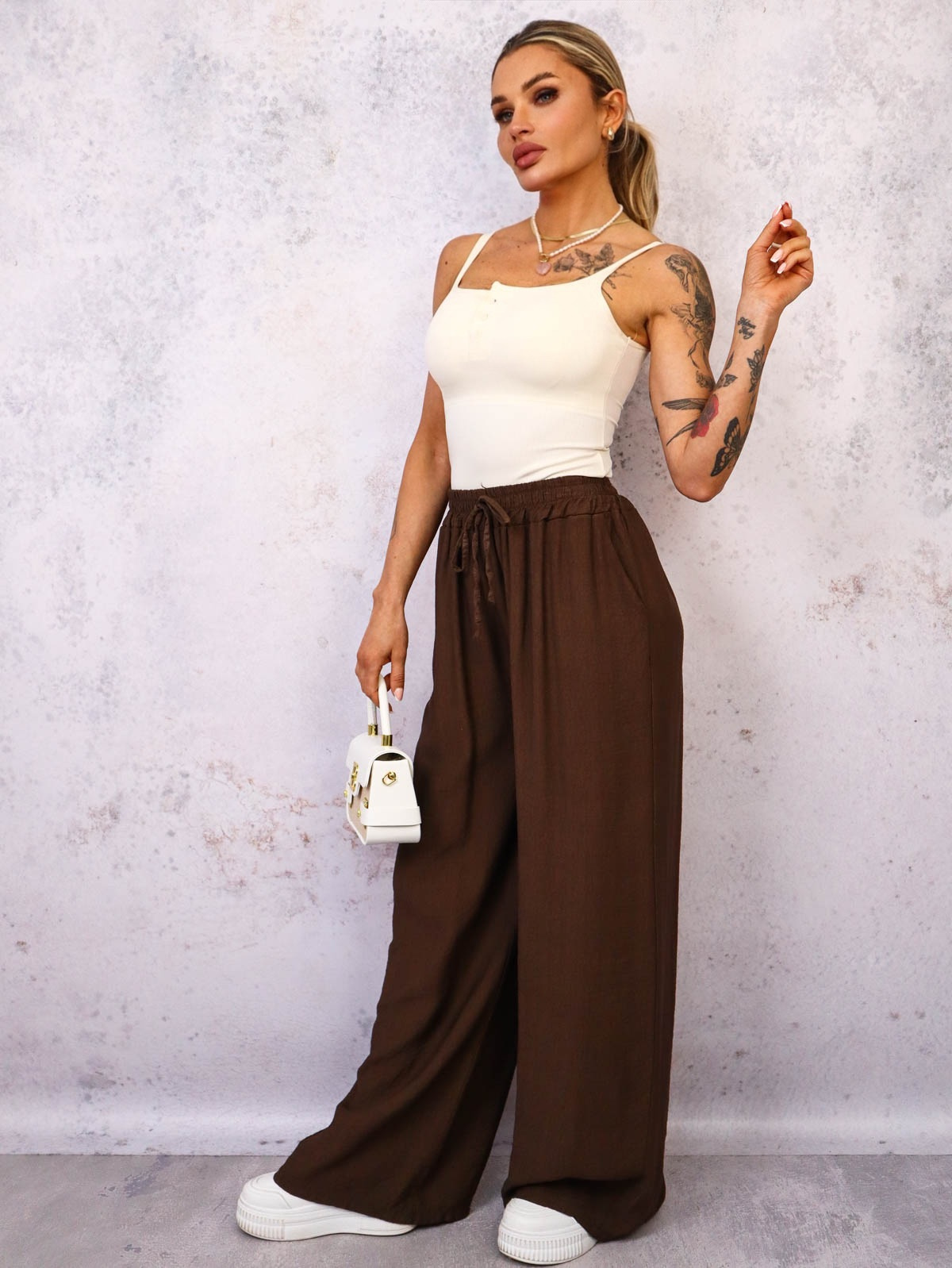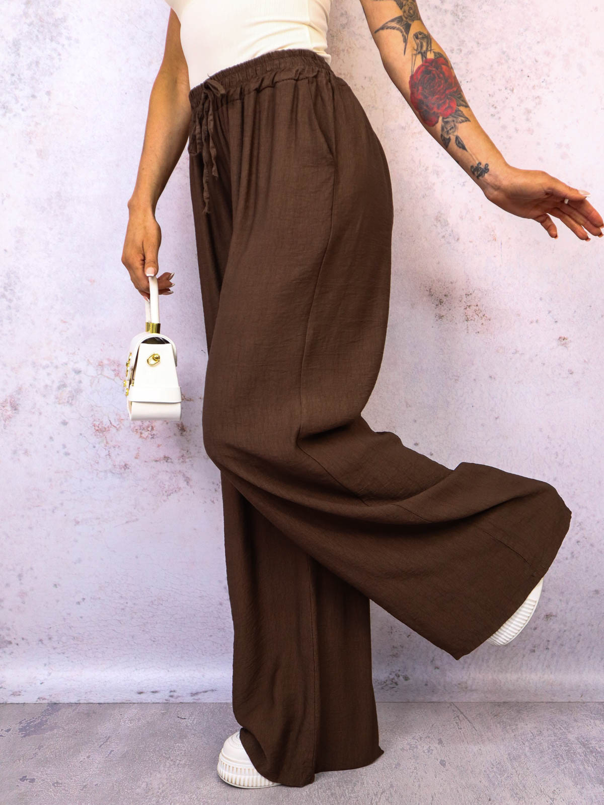 SPODNIE MATERIAŁOWE Z SZEROKIMI NOGAWKAMI- CIEMNOBRĄZOWE