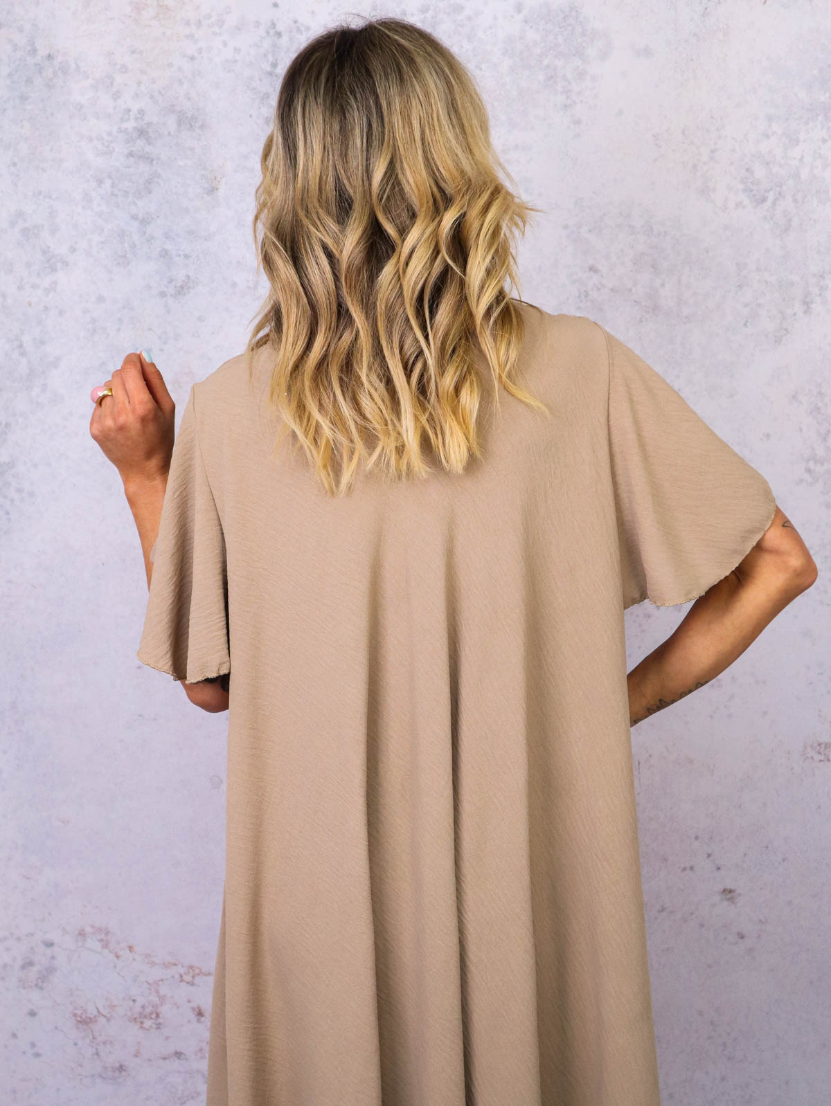SUKIENKA Z KWIATEM I FALBANAMI NA RĘKAWACH- BRĄZOWA