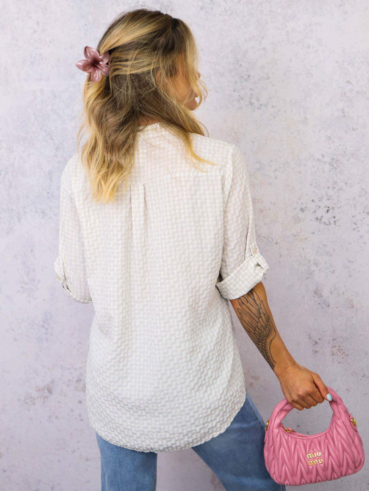 BLUZKA KOSZULOWA W KRATKĘ- JASNOBEŻOWA