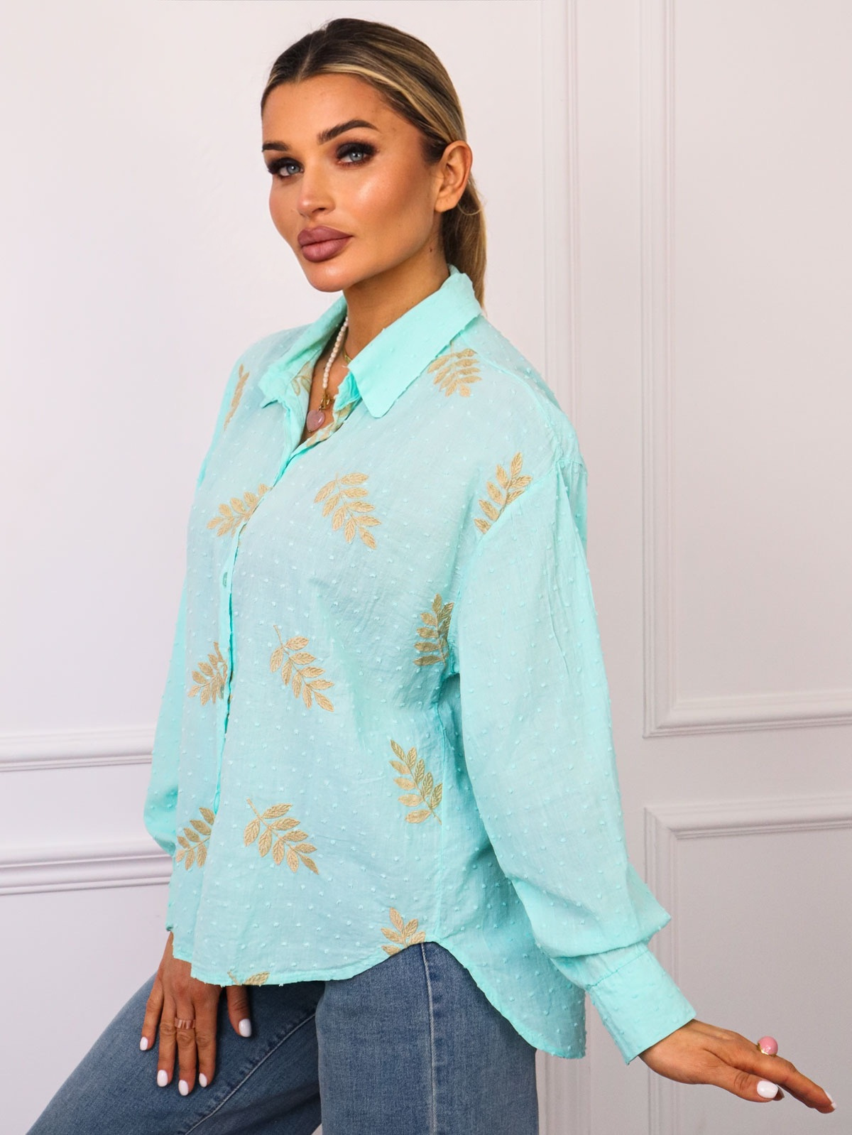 KOSZULA Z OZDOBNYM HAFTEM Z PRZODU- MIĘTOWA