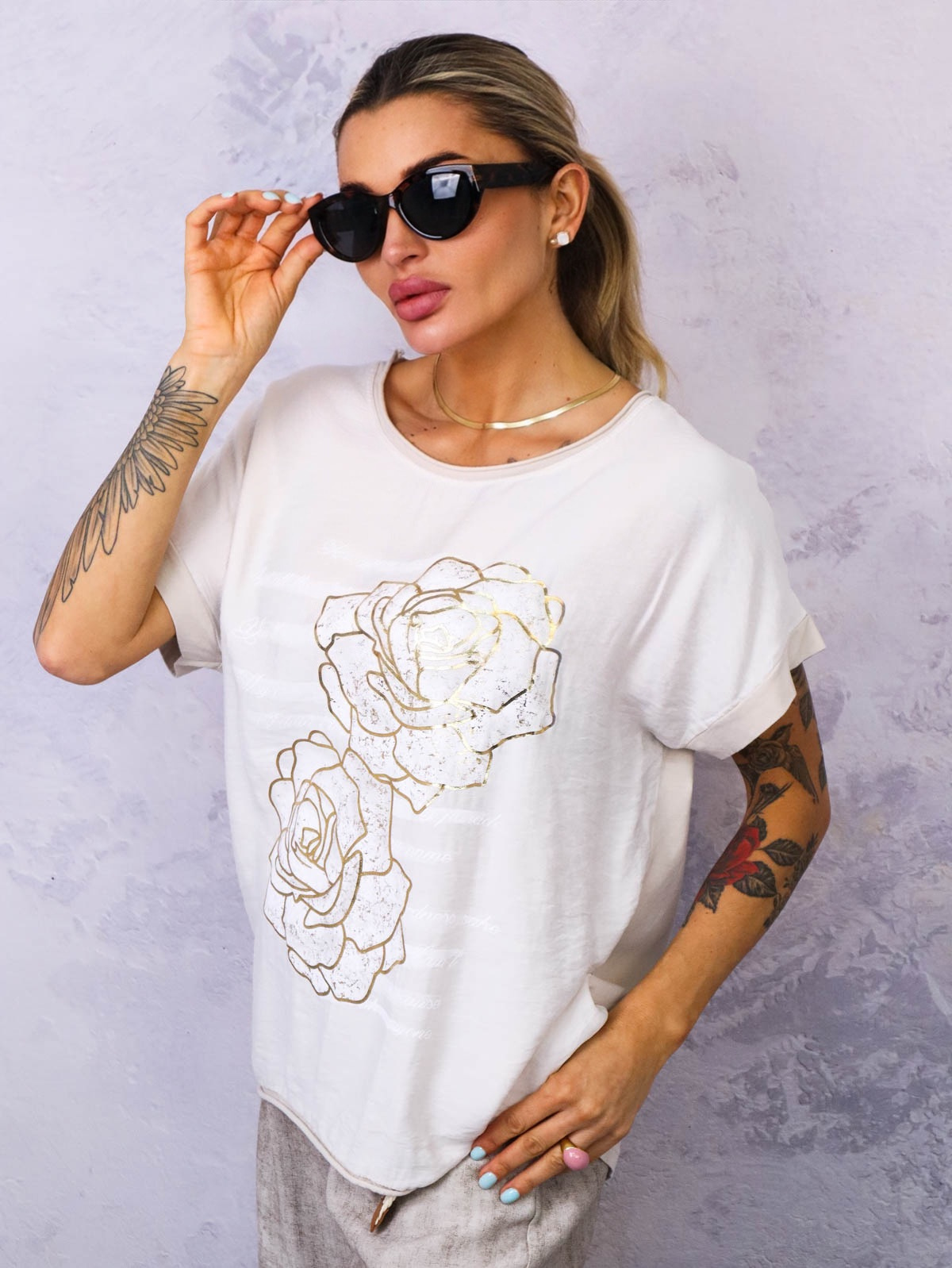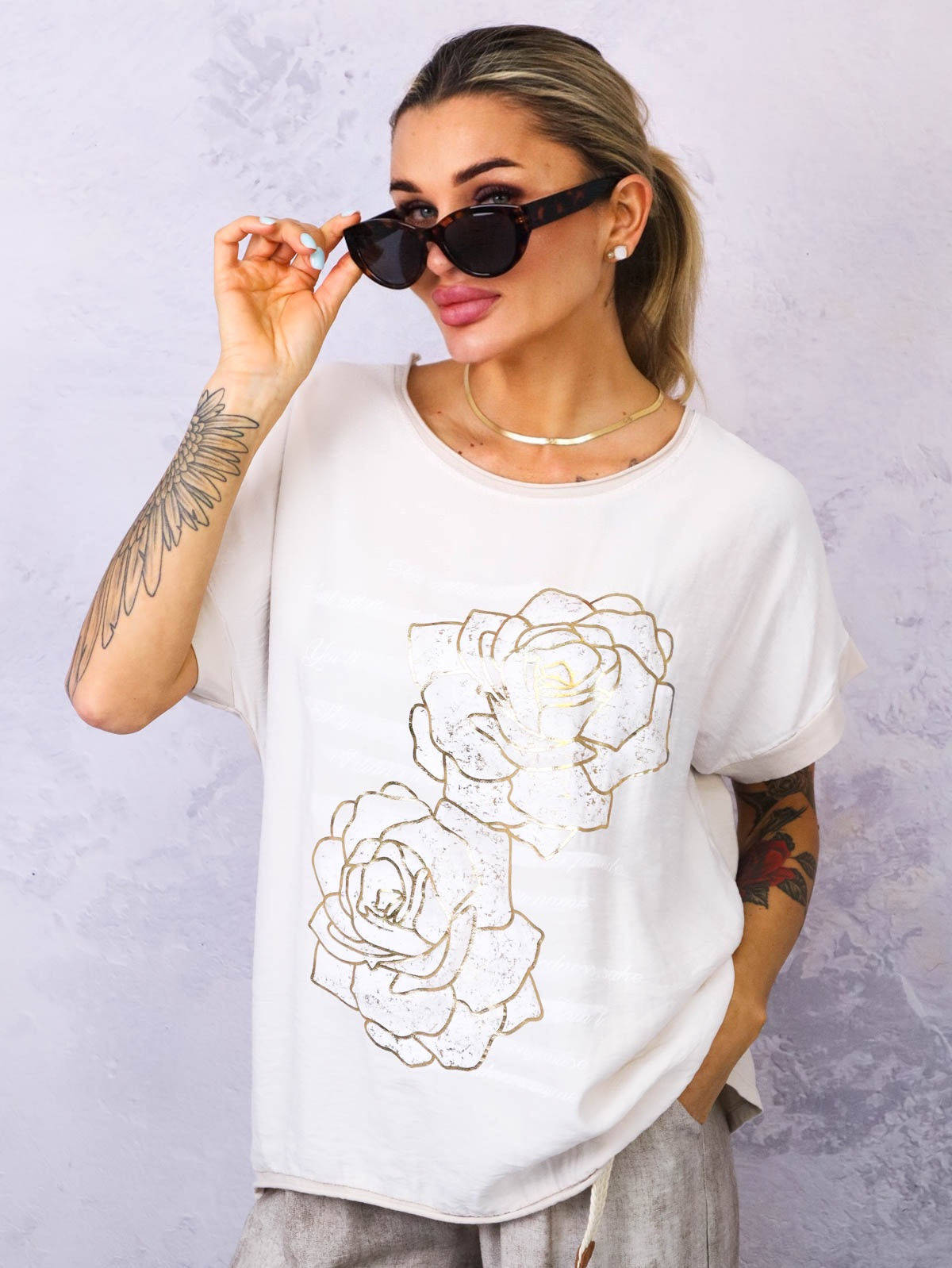 Bluzka oversize z ozdobnymi złotymi kwiatami. Dół i dekolt surowo zakończony.