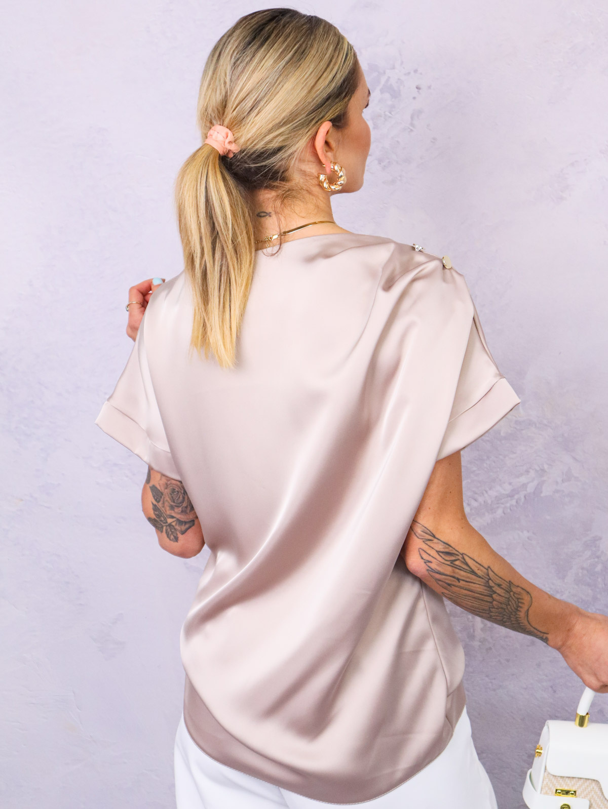 SATYNOWA BLUZKA Z OZDOBNYMI GUZIKAMI NA RAMIENIU- BEŻOWA