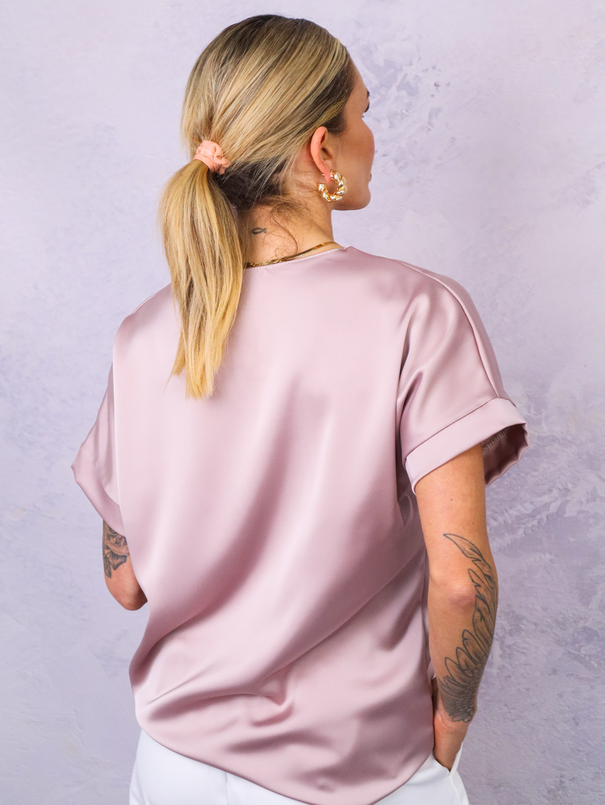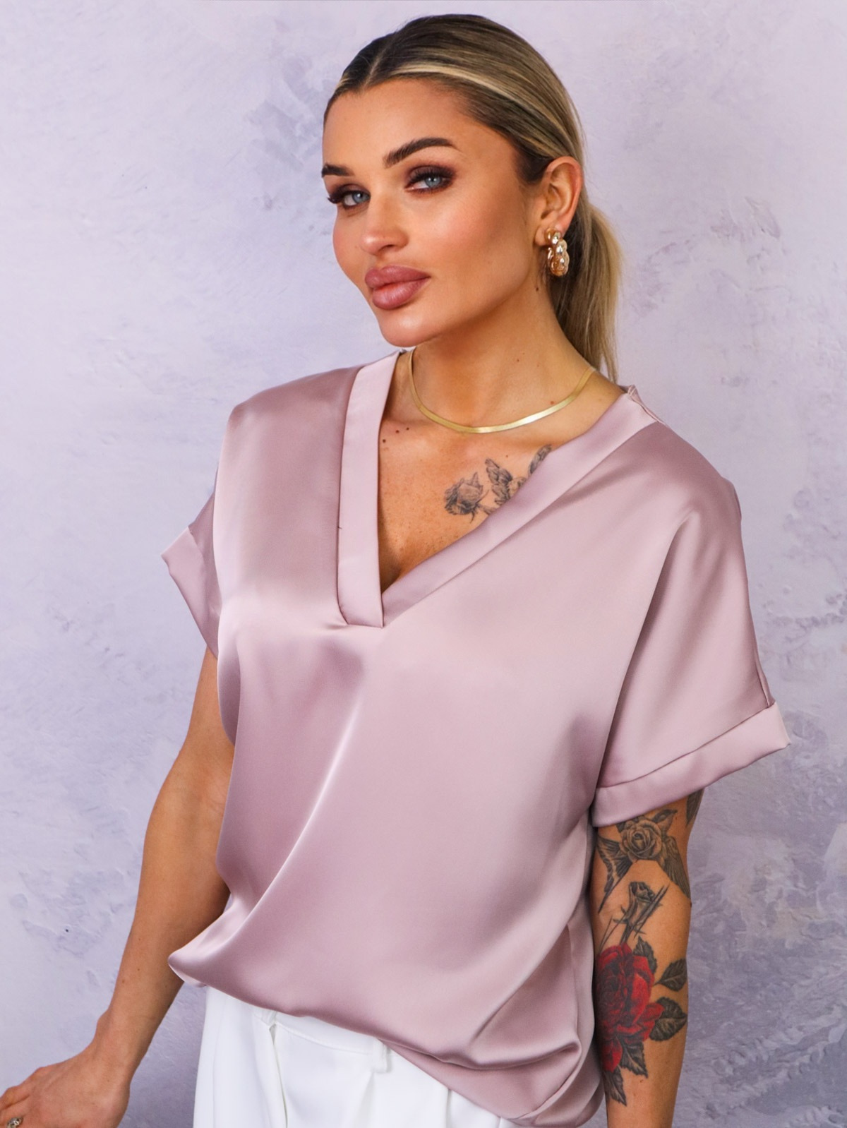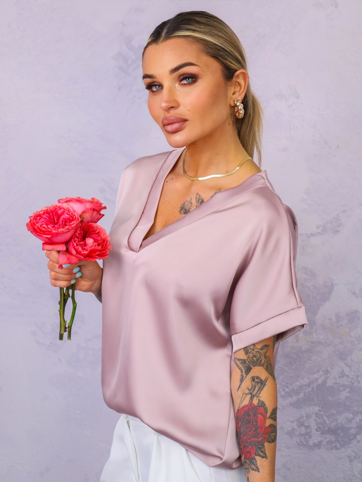 BLUZKA SATYNOWA Z DEKOLTEM W SEREK- RÓŻOWA