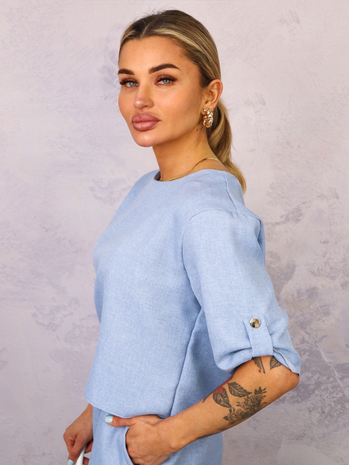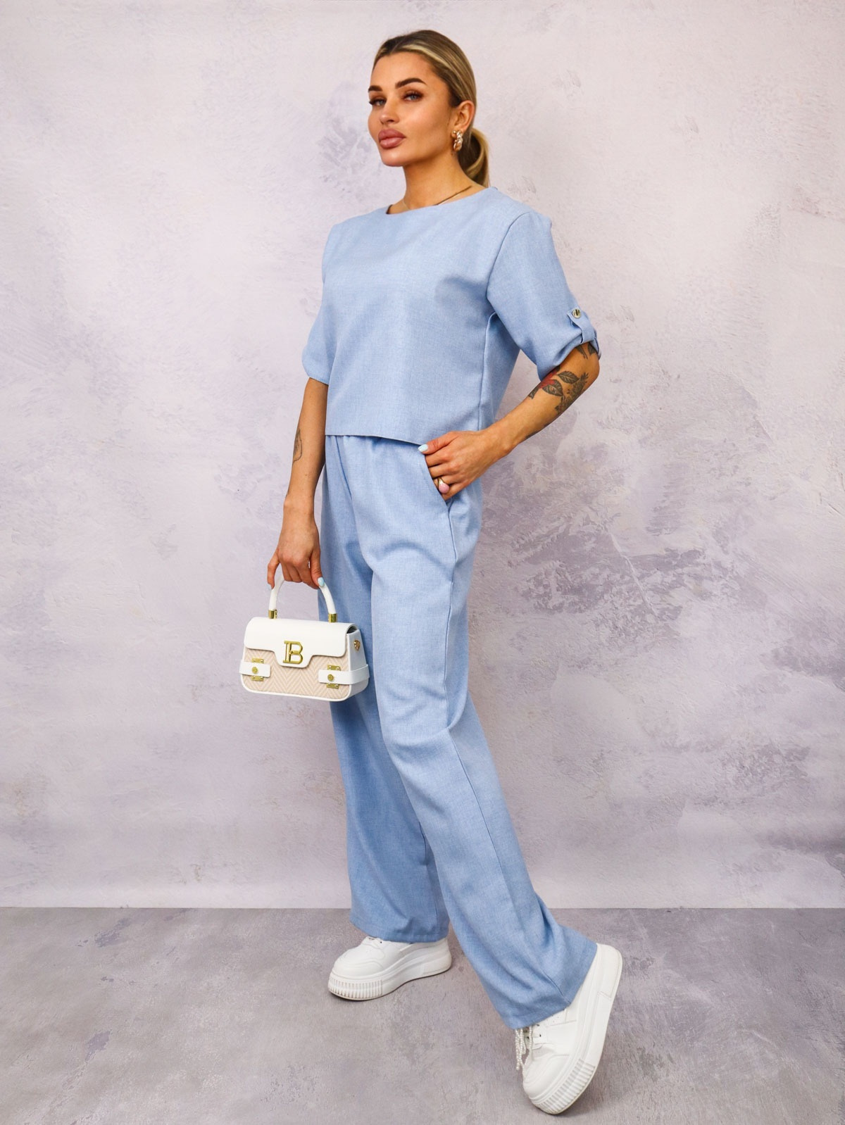 Komplet materiałowy krótka bluzka z podwijanymi rękawami+ spodnie z szerokimi nogawkami i gumą w pasie.