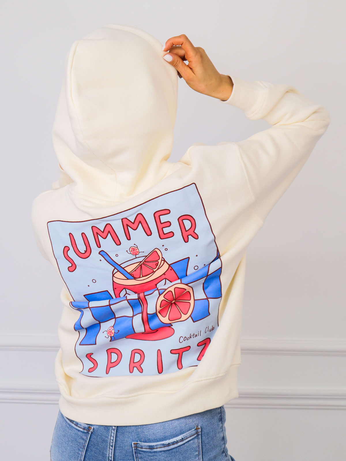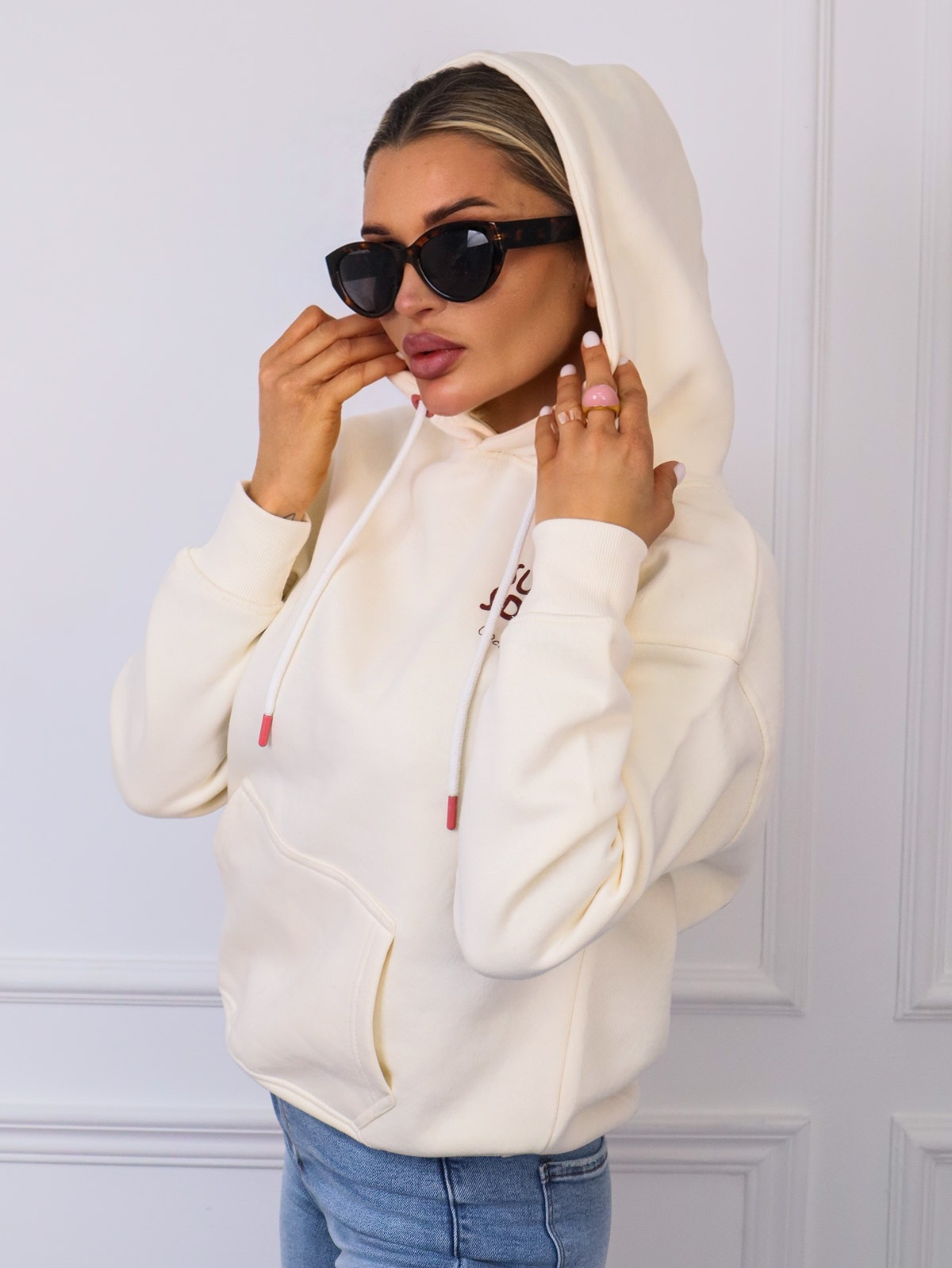 BLUZA Z KAPTUREM Z NAPISEM Z PRZODU I APIKACJĄ NA PLECACH- BIAŁA