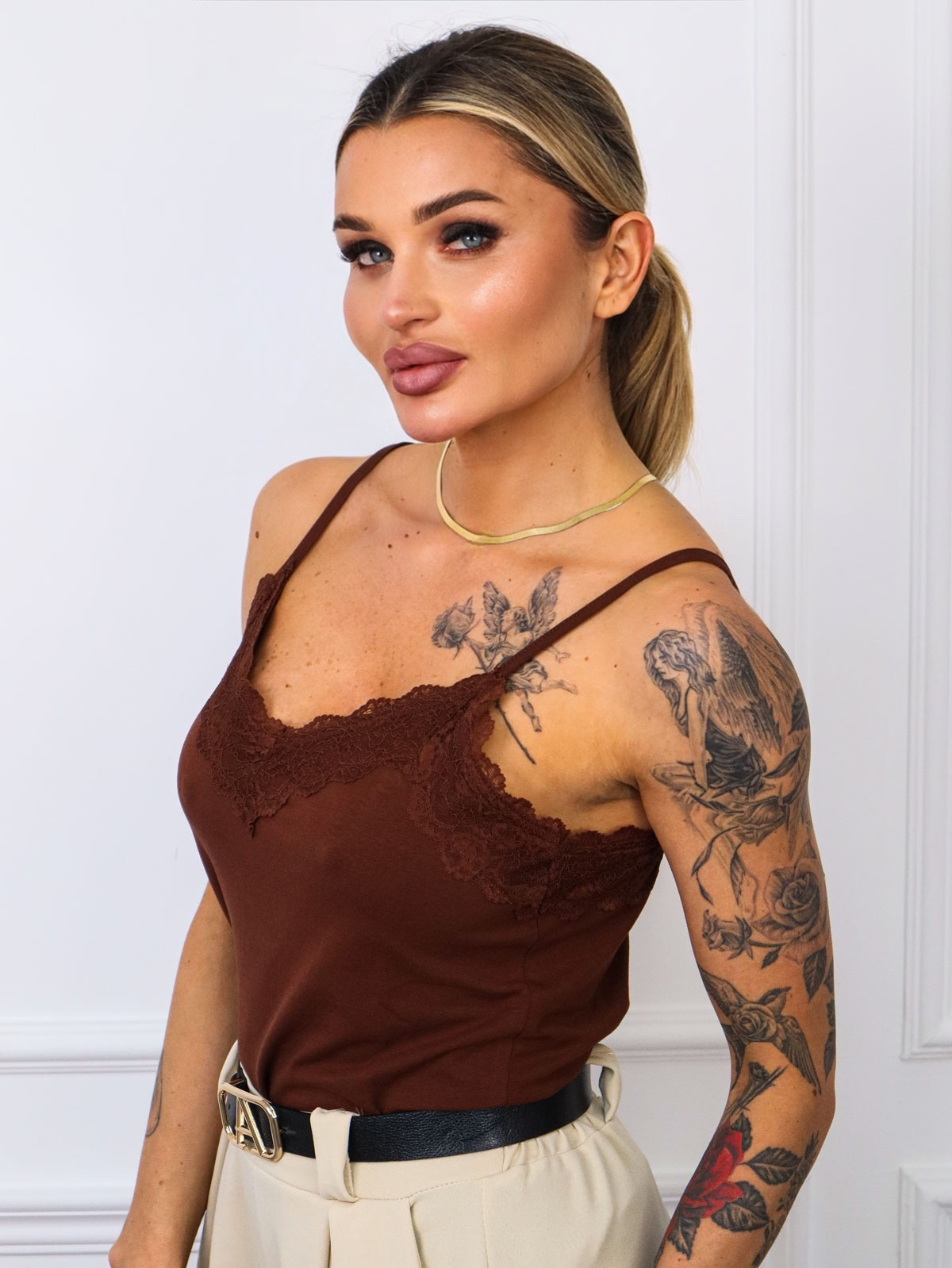 TOP NA RAMIĄCZKACH Z OZDOBNĄ KORONKĄ- BRĄZOWY
