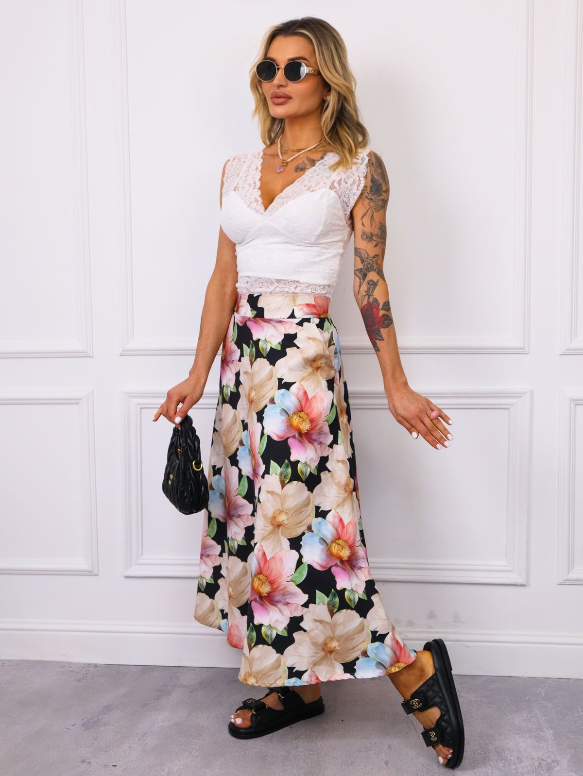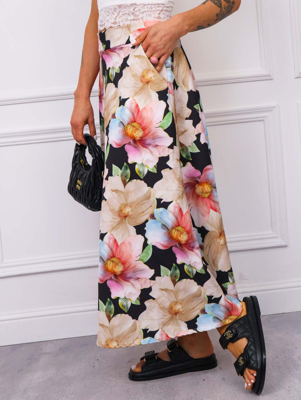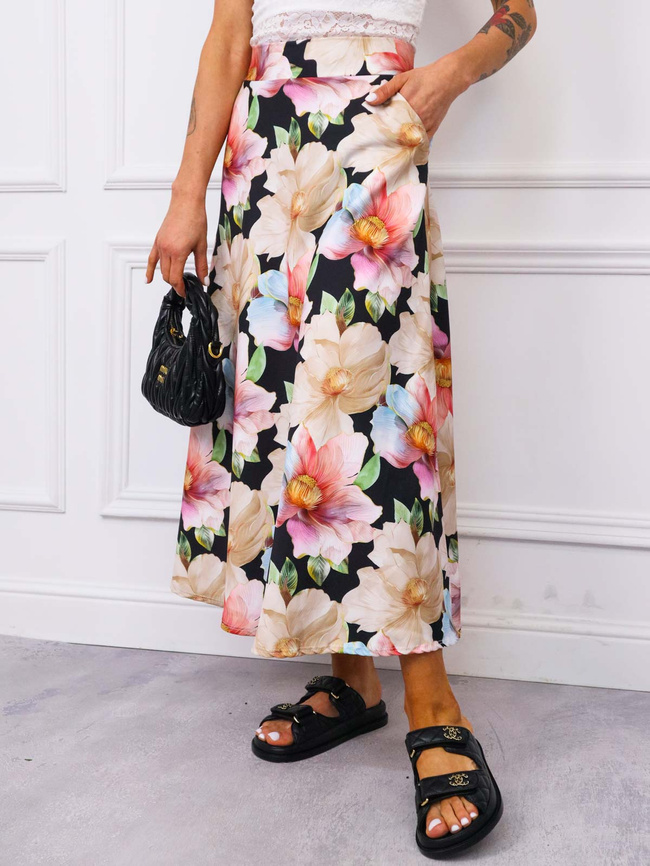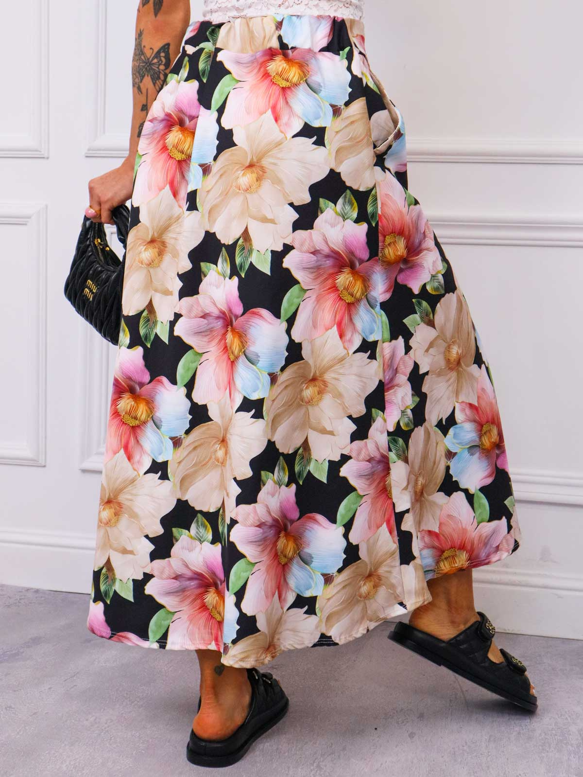 SPÓDNICA MIDI W KWIATY- CZARNA