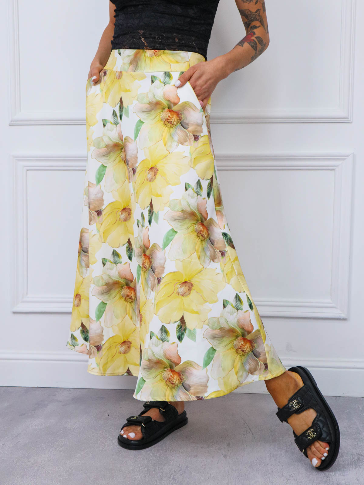 SPÓDNICA MIDI W KWIATY- ŻÓŁTA